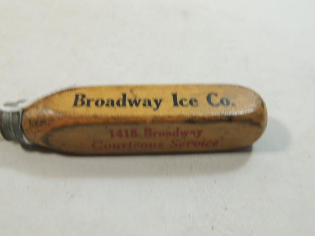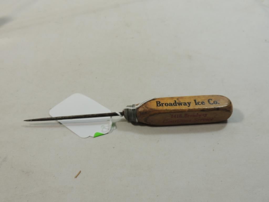 VINTAGE ICE PICK BROADWAY ICE COMPANY ICE PICK WOODEN HANDLE ICE PICK AS SHOWN SEE PHOTO FOR MORE DETIALS.