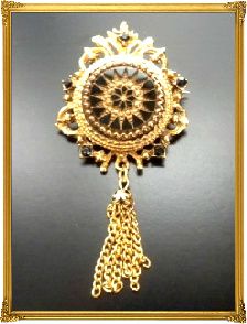 Black onyx, ornate golden design. Black rhinestones and a tassel at the bottom make this very elegant.