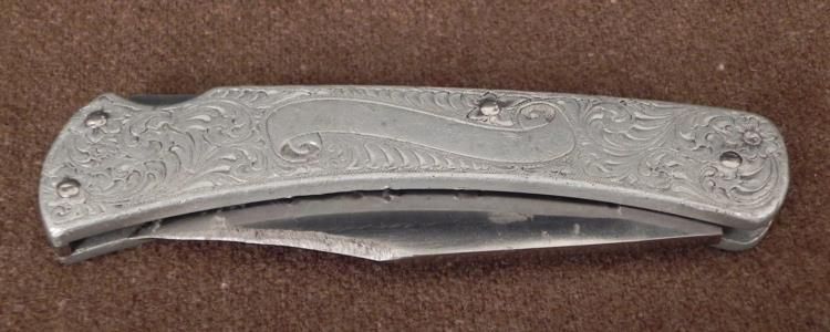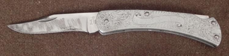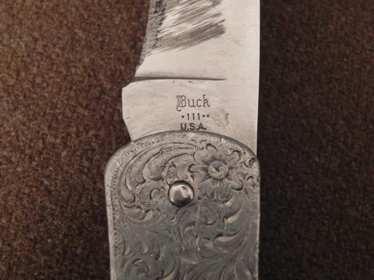 VINTAGE "BUCK" ENGRAVED HANDLE FOLDING KNIFE MODEL 111-FILEGREE & NAME PANEL * * 8 1/2" WHEN OPENED-BLADE SHOWS SHARPENING-HANDLE HAS GREAT LOOKING METALWORK-PUSH BACK CLOSURE *