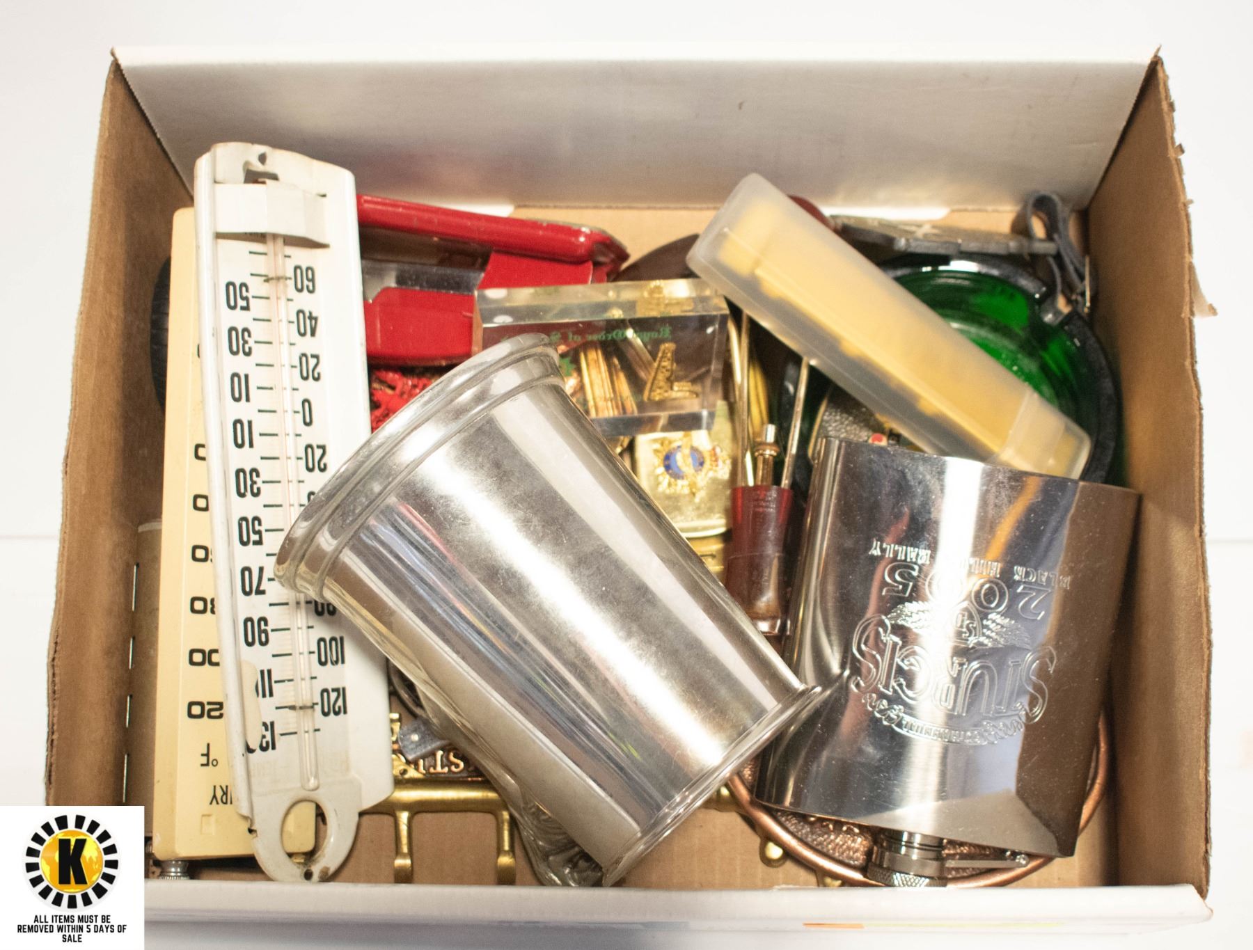 VINTAGE BUCKLES, PIPES, MILITARY ETC.- BOX LOT