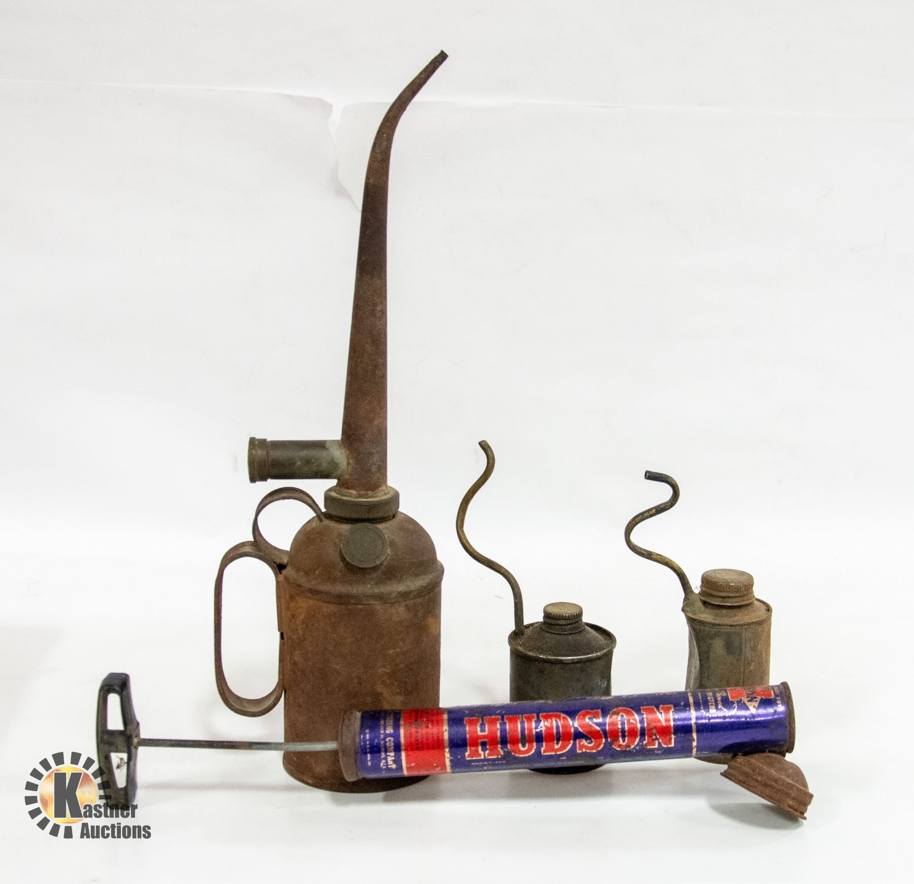 VINTAGE HUDSON BUG SPRAYER, ABBEY OIL CAN PUMP MADE IN ENGLAND, 2 OIL CANS