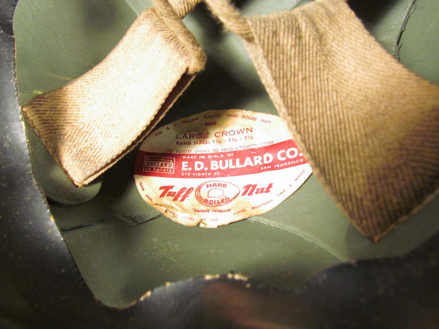 VINTAGE BULLARD HARDHAT W/ ORIG. PAPER LABEL AND LINER - Paper label reads Large Crown E.D. Bullard Co. Tuff Nut Hard Boiled.