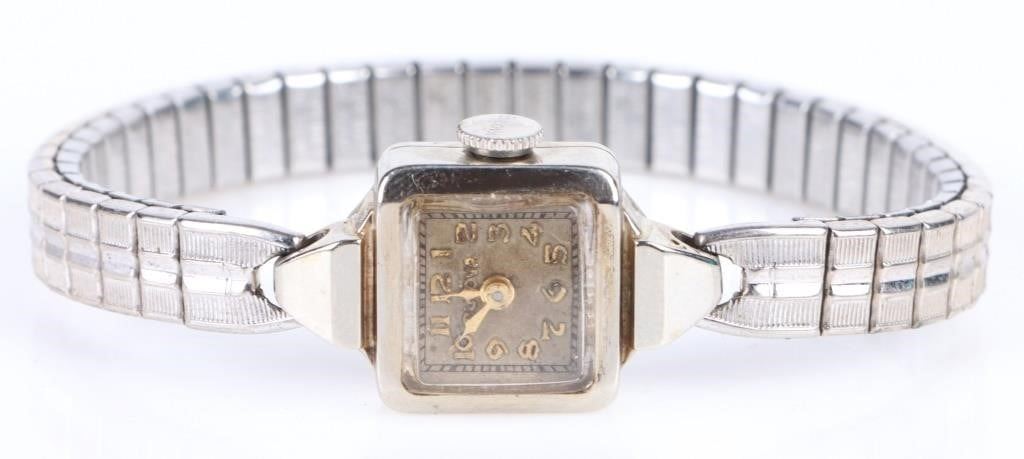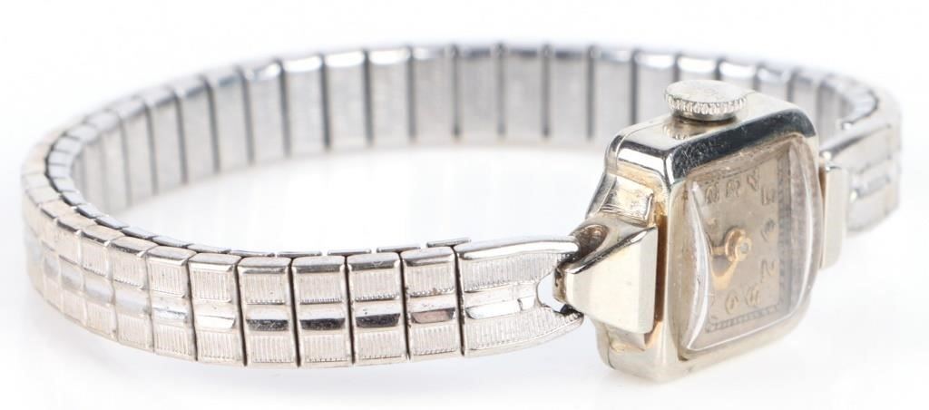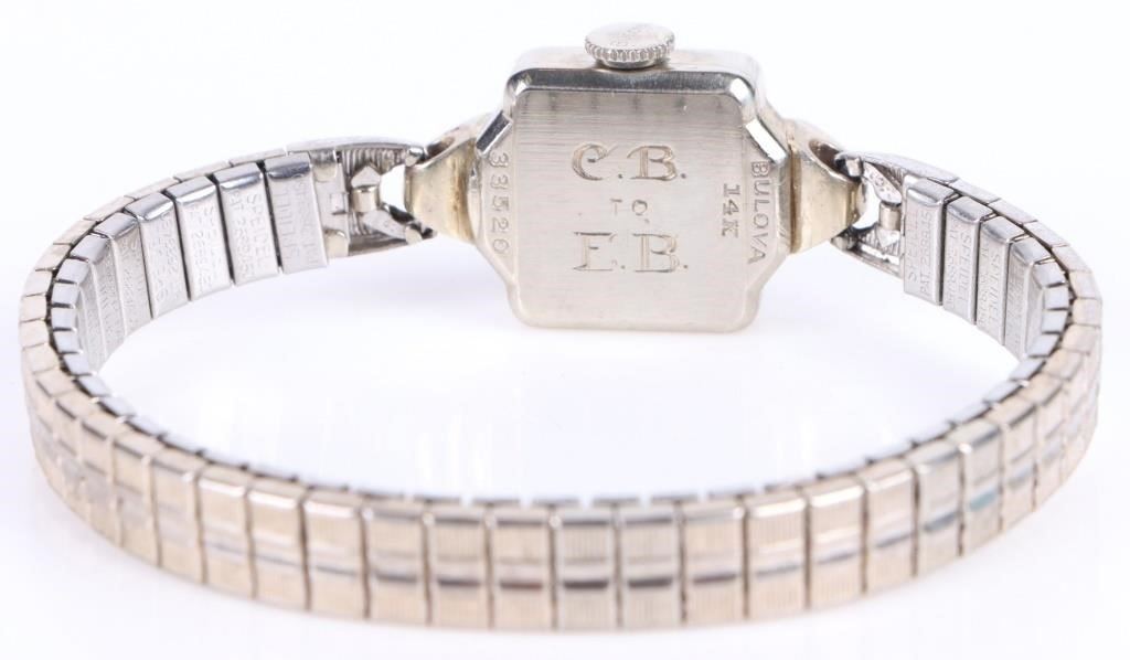 Vintage Bulova 14K white gold ladies wristwatch to include a Speidel USA band, and a14K white gold bezel and back. Engraved C.B. to E.B. on back.