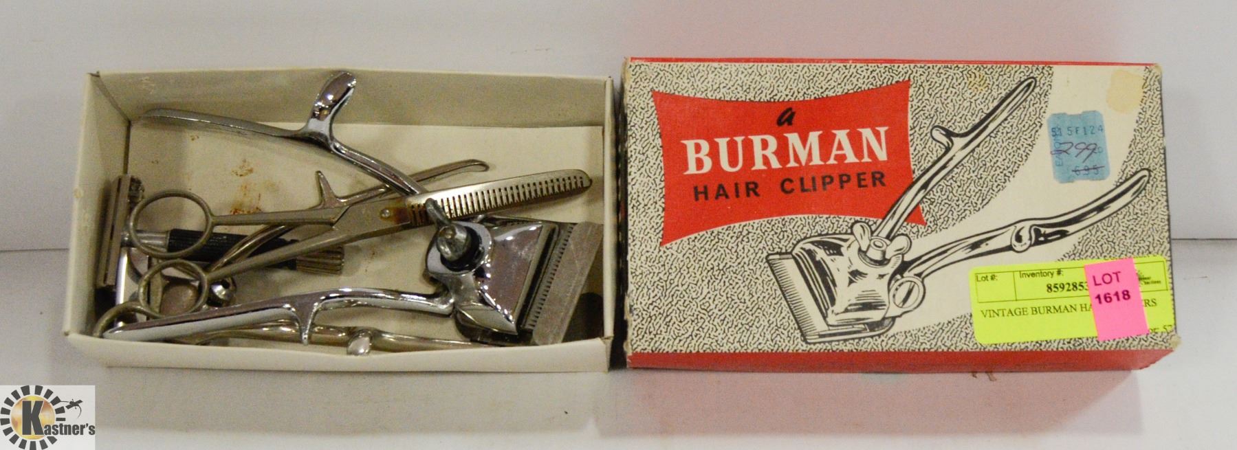 VINTAGE BURMAN HAIR CLIPPERS. TWO WITH RAZOR AND SPECIAL HAIR CUTTING SCISSORS