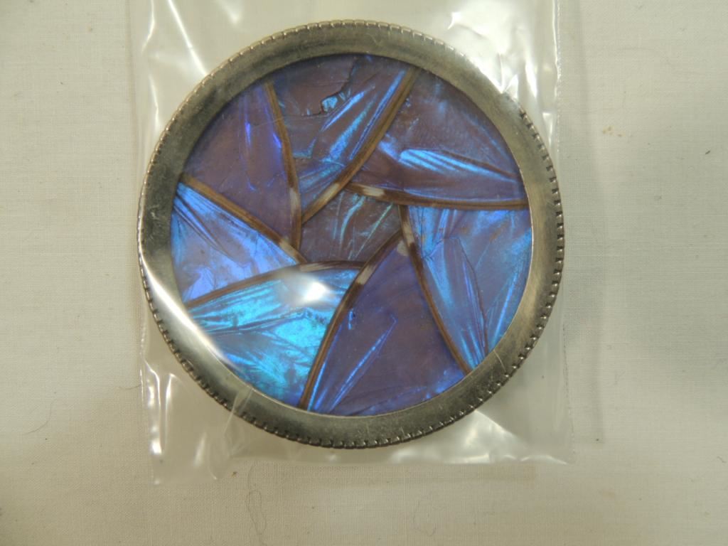 FRENCH VINTAGE BUTTERFLY WING PIN DISH BUTTERFLY WINGS MORPHO WINGS BLUE AS SHOWN SEE PHOTO FOR MORE DETAILS.
