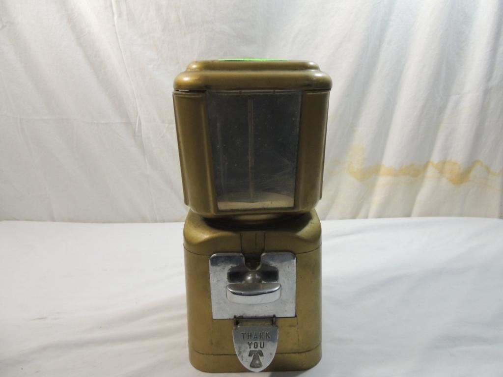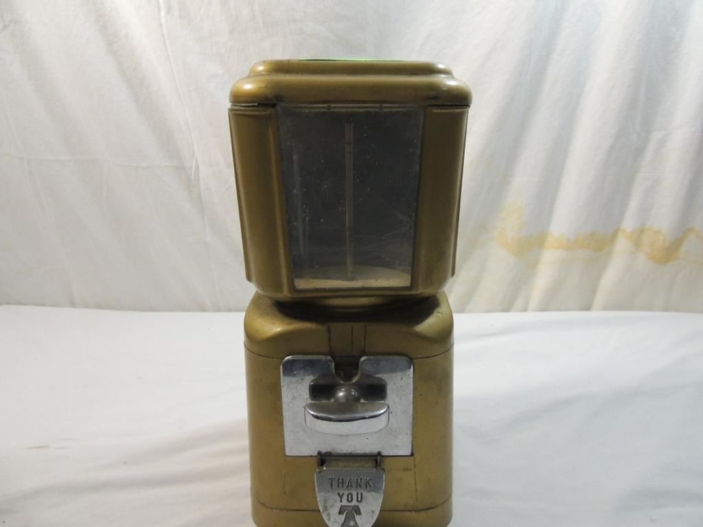 GOLDTONE SQUARE GUMBALL MACHINE, CANDY MACHINE, TABLE TOP AS SHOWN SEE PHOTO FOR MORE DETAILS.