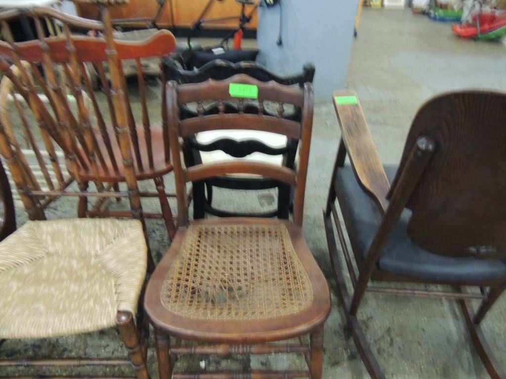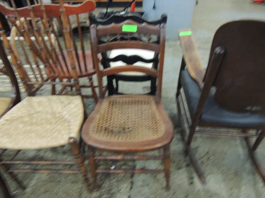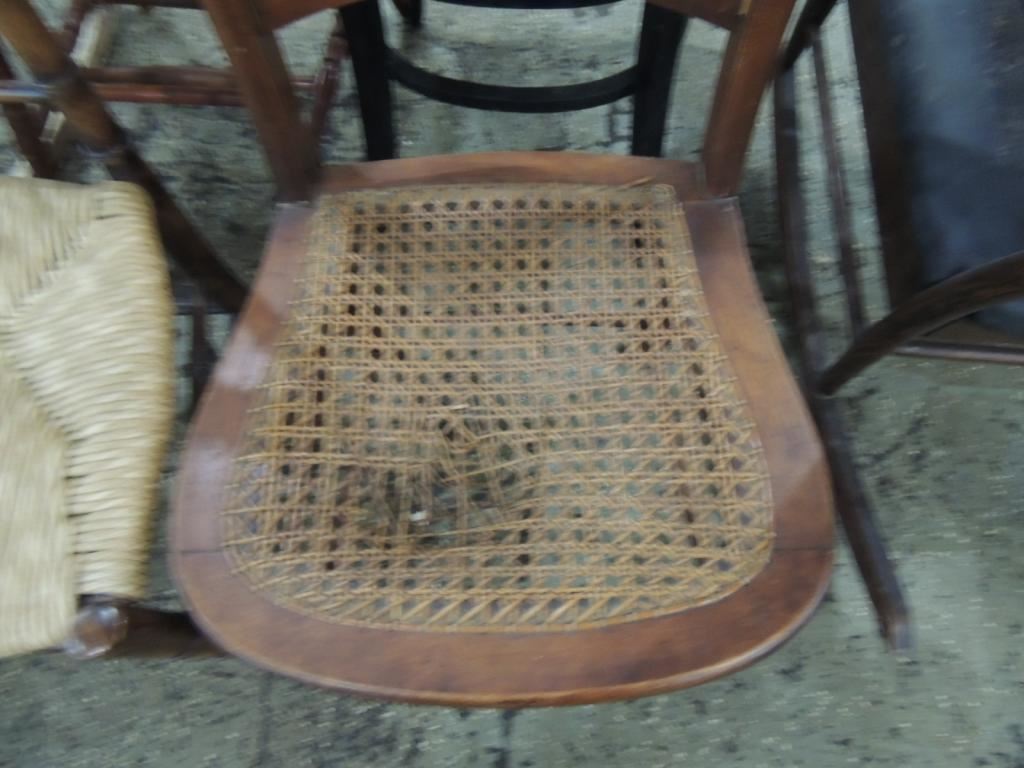 VINTAGE CANE SEAT DINING CHAIR NEED OF SLIGHT REPAIR AS SHOWN SEE PHOTO FOR MORE DETAILS.