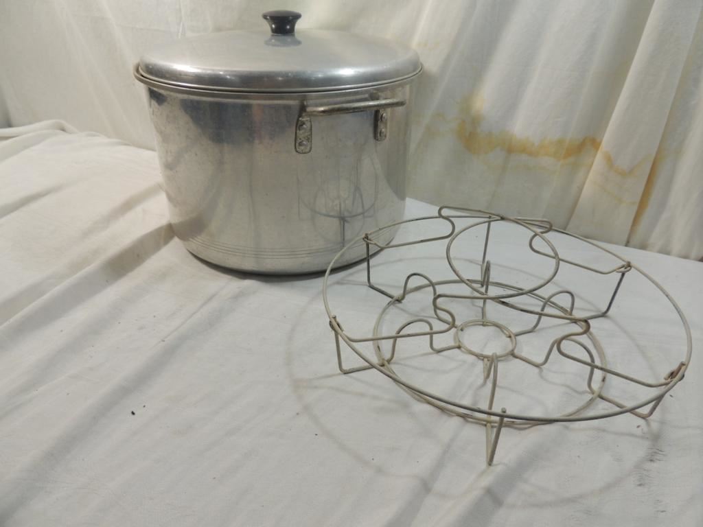 VINTAGE CANNING POT, CANNING TRAY IN STOCK POT, VINTAGE POT, COOKWARE AS SHOWN SEE PHOTO FOR MORE DETAILS.