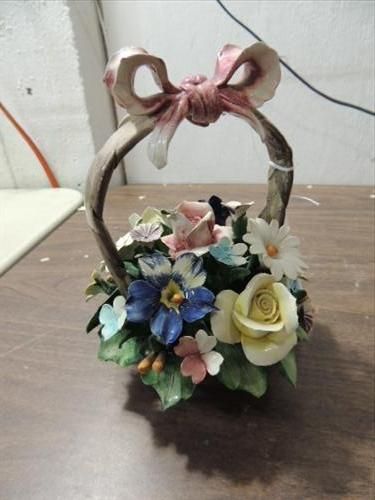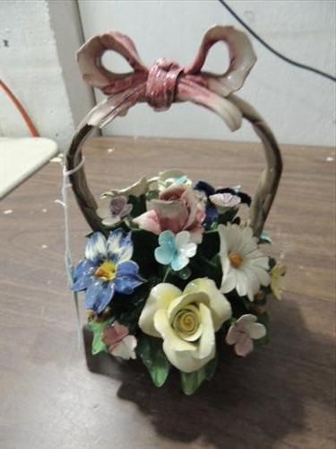 VINTAGE CAPODIMONTE CERAMIC FLOWER BASKET. SLIGHT DAMAGE TO ONE FLOWER. AS SHOWN. VIEW PICTURE FOR DETAIL.