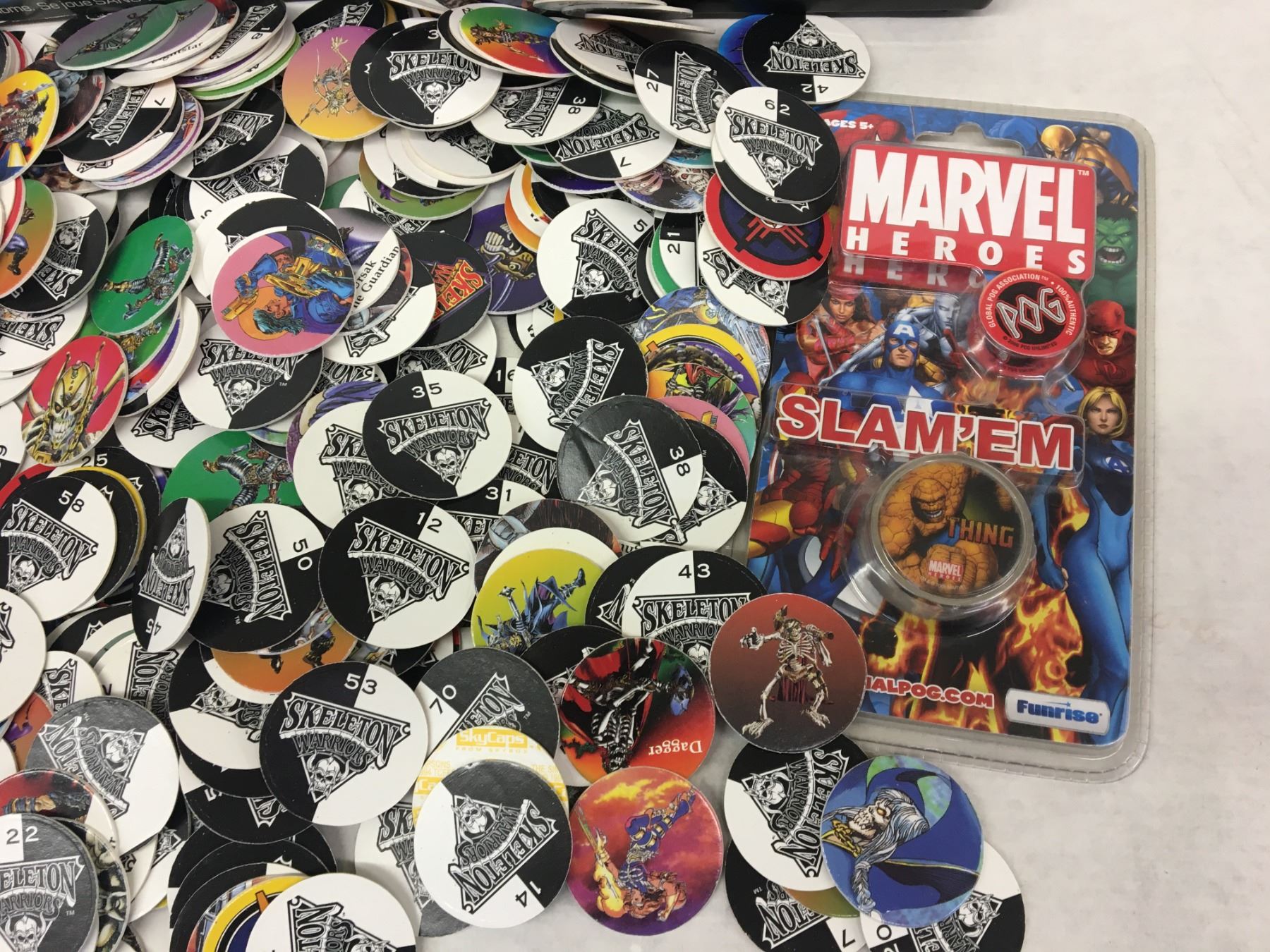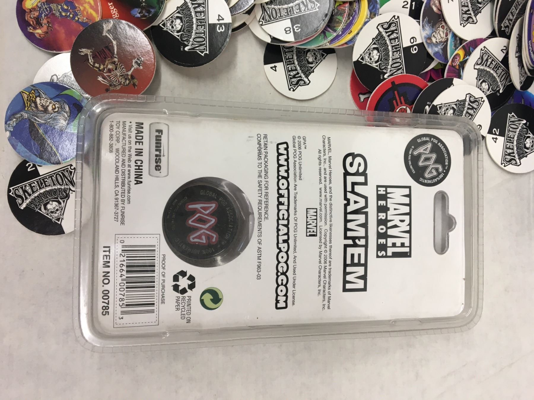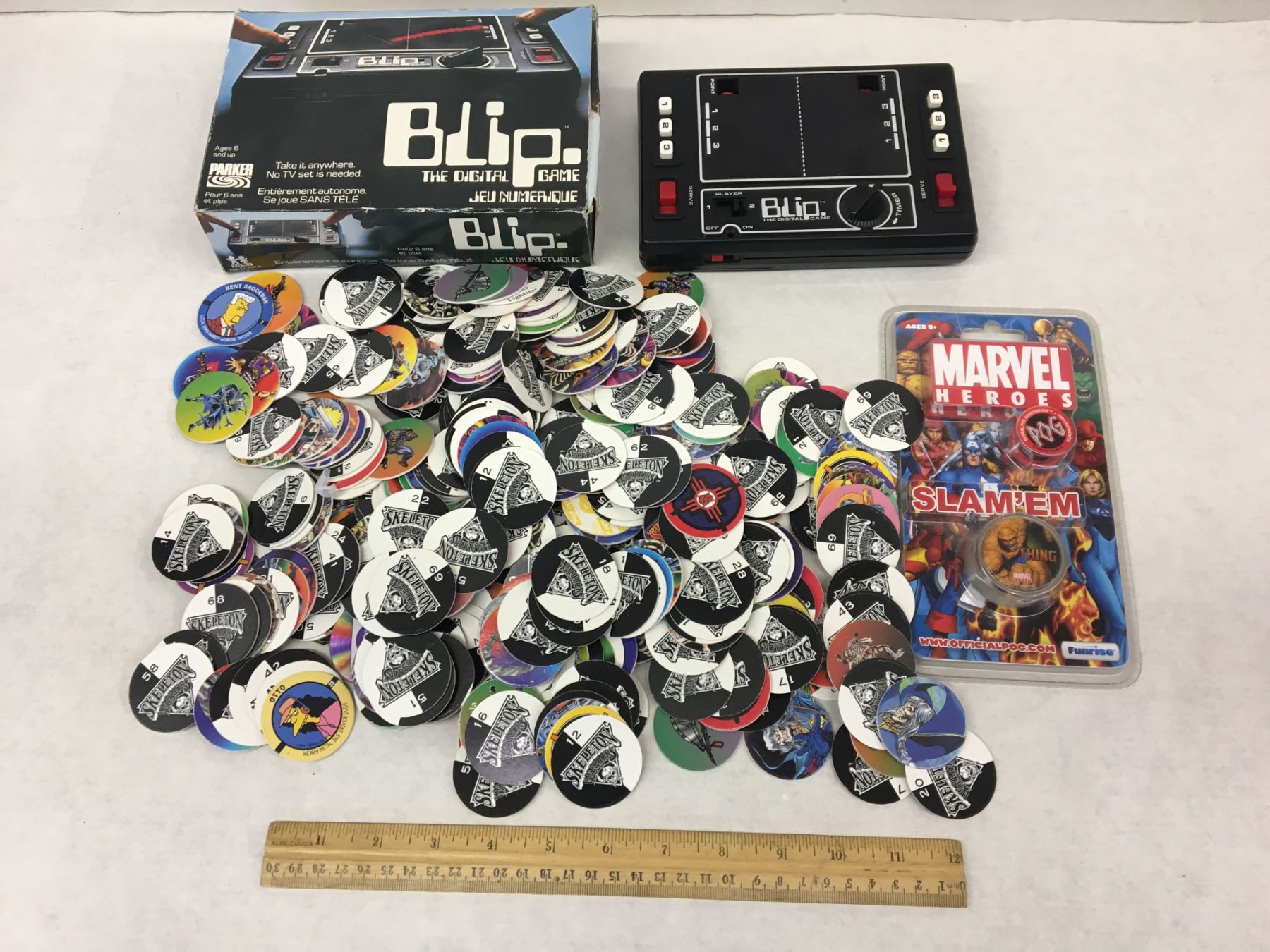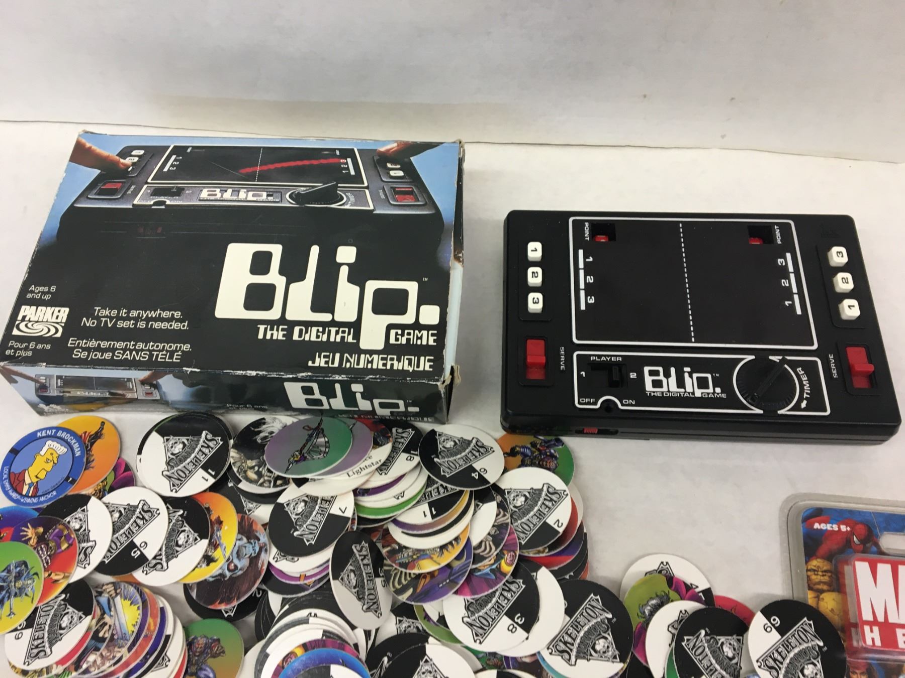 VINTAGE CAPS AND POG MARVEL SLAMMER AND BLIP DIGITAL GAME WITH BOX WORKING