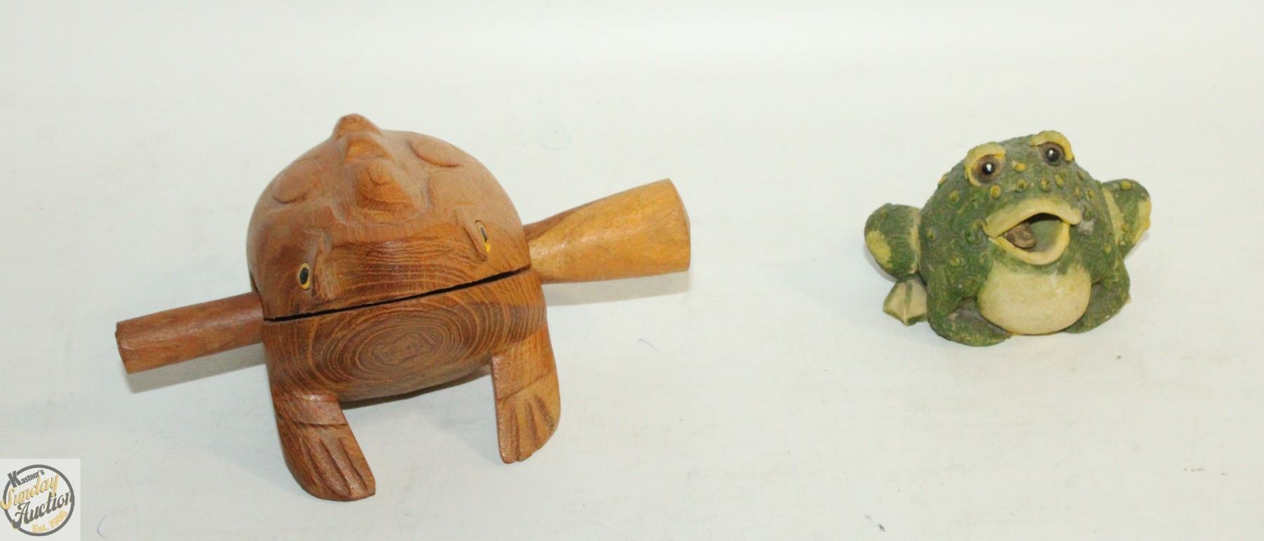 VINTAGE CARVED CROAKING FROG WITH FIGURINE
