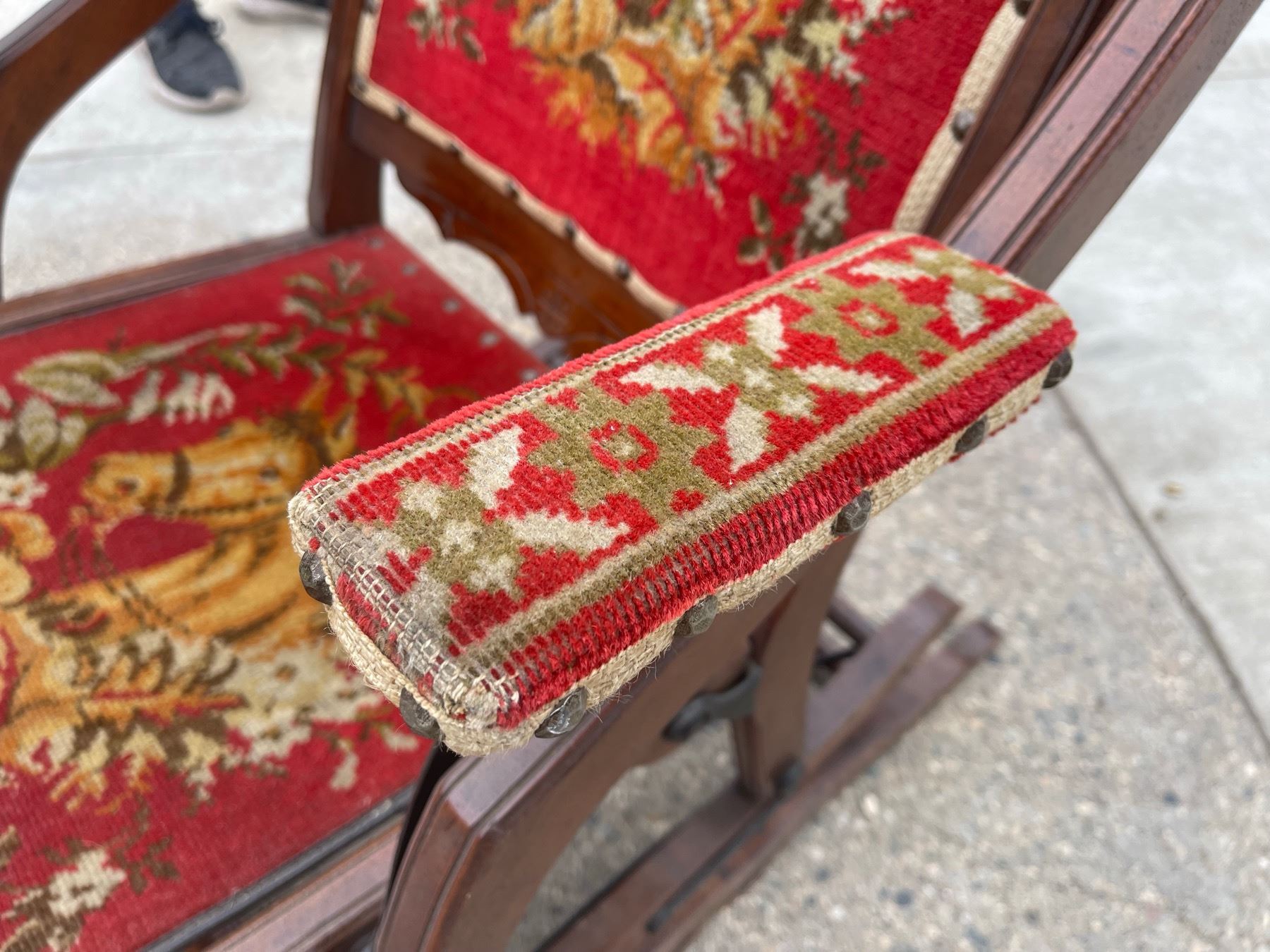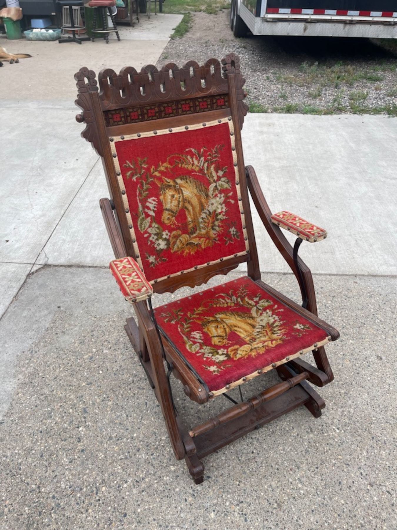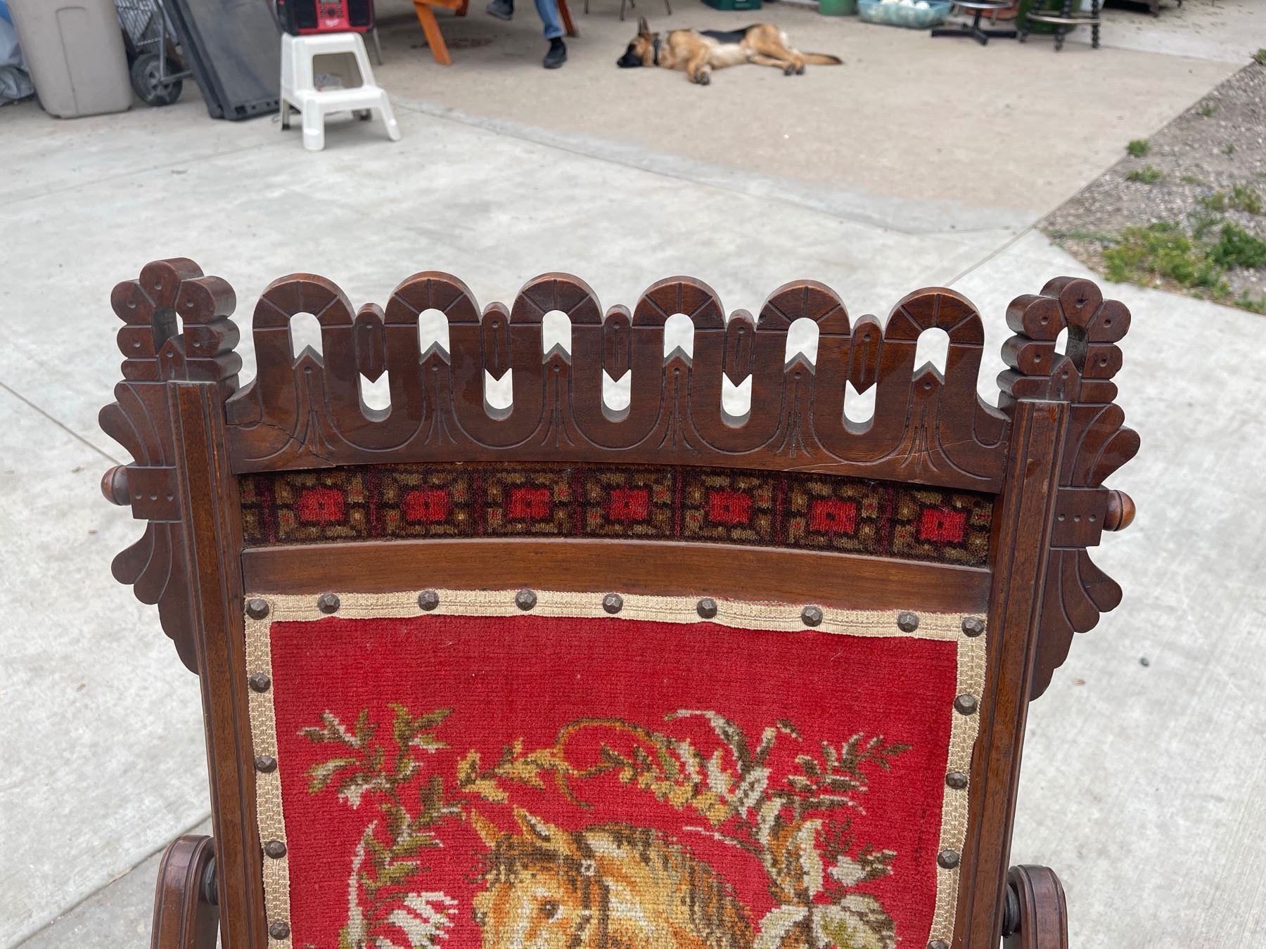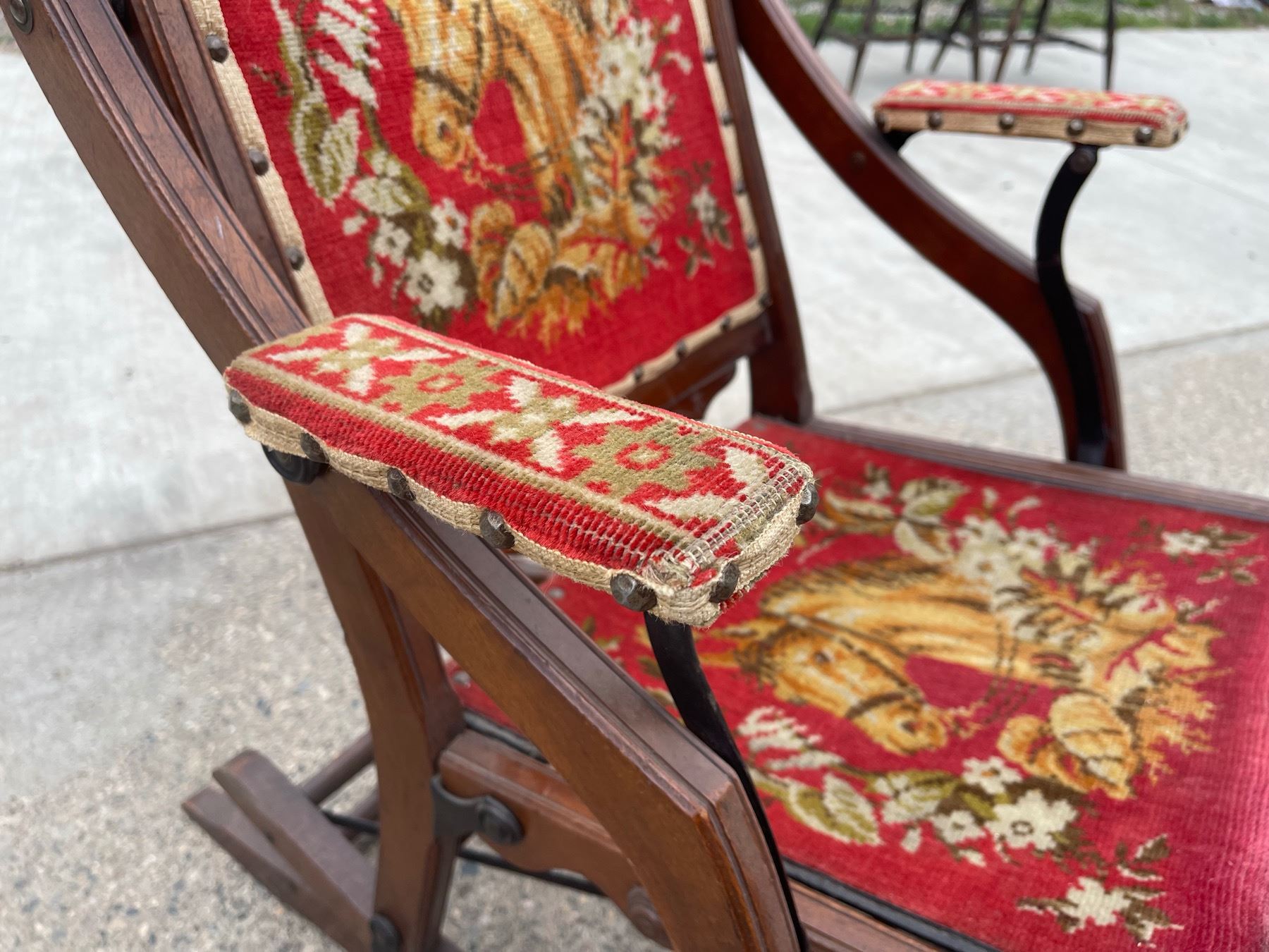UNIQUE VINTAGE CARVED WOOD ROCKER WITH GORGEOUSLY EMBROIDERED HORSE UPHOLSTERY ON BACK AND SEAT AND FINE LOVELY ARM RESTS; NOTE THE INTRICATE STITCHING AND FINE DETAILS! THE MATERIAL IS IN GREAT CONDITION WITHOUT ANY OBVIOUS WEAR; THE BACK IS ALSO FINISHED; THE VINTAGE ROCKING MECHANISM IS INTACT AND WORKS NICELY; THIS IS A MUST FOR HORSE LOVERS!