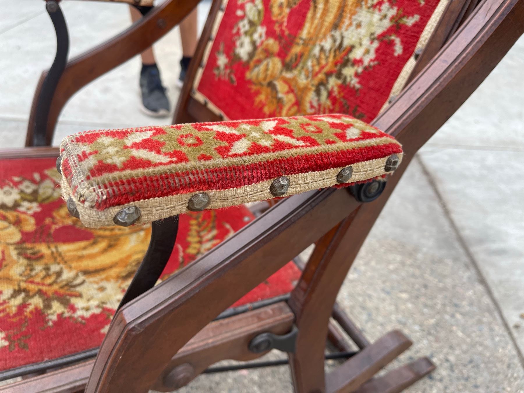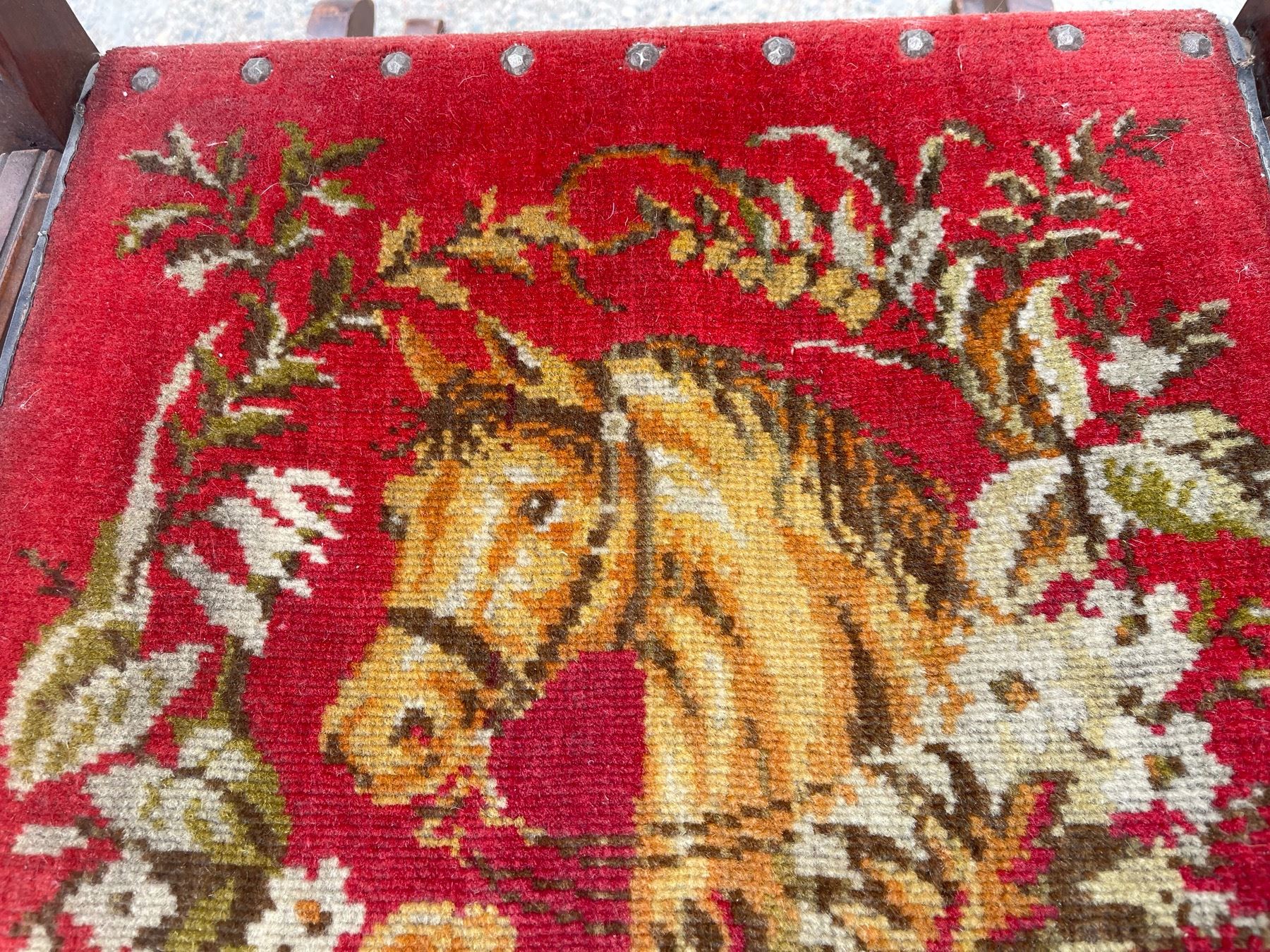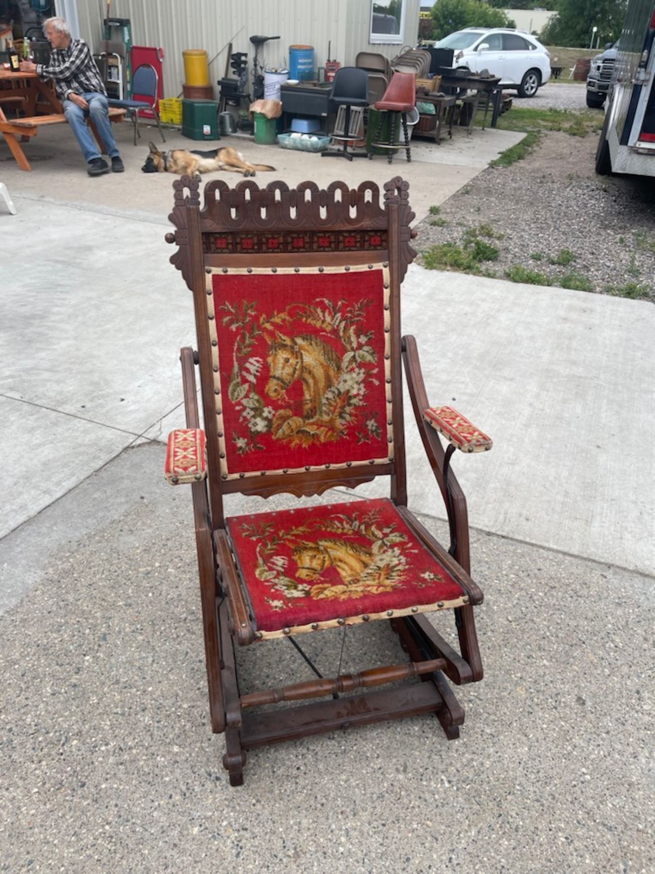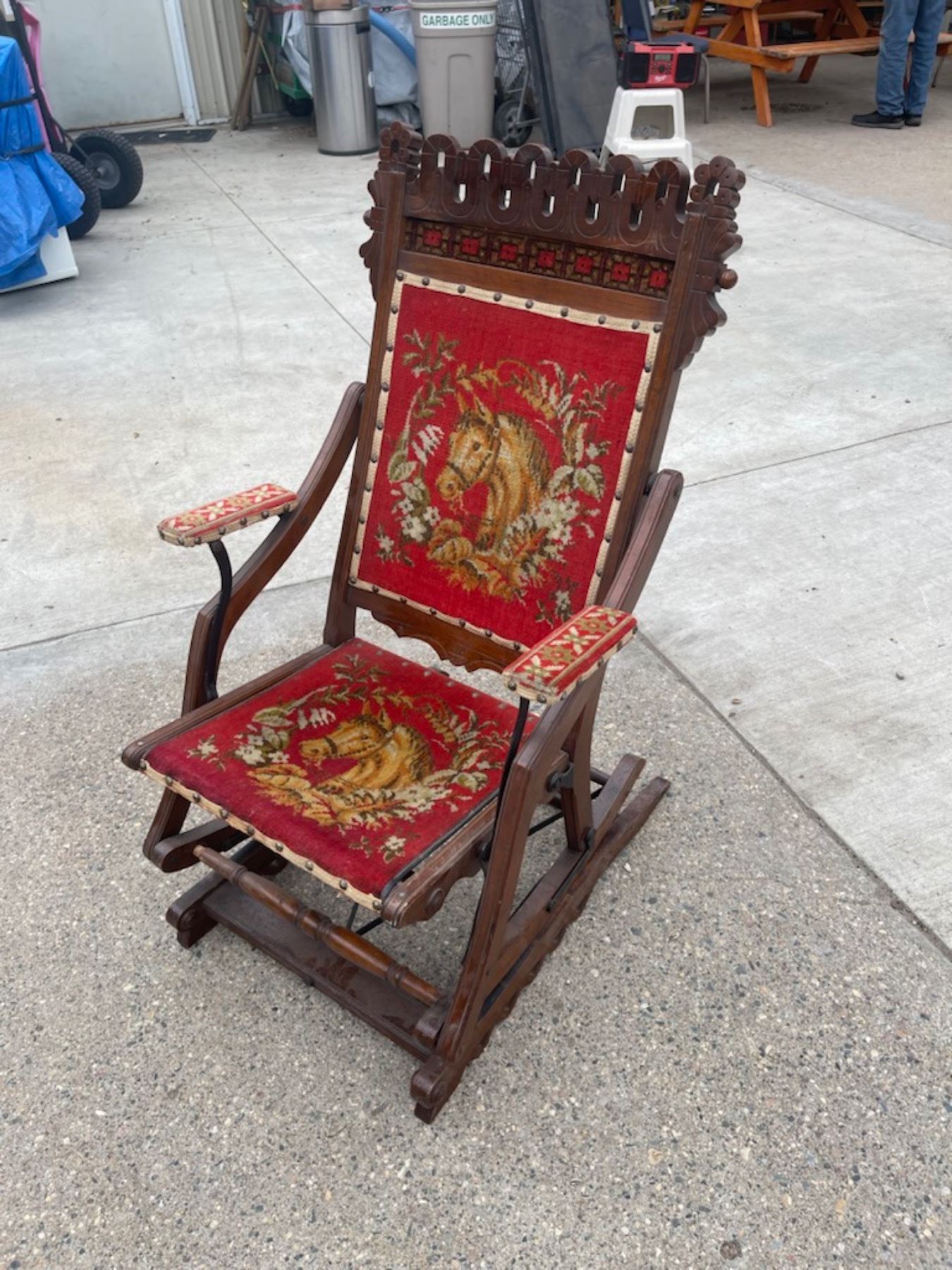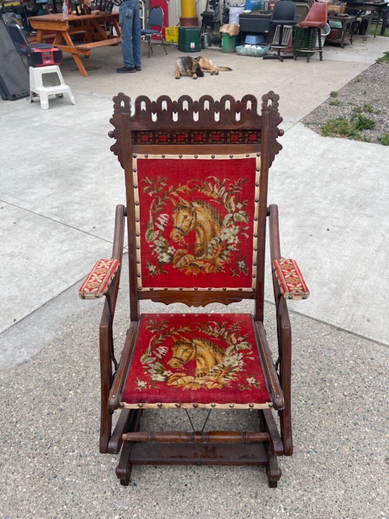 UNIQUE VINTAGE CARVED WOOD ROCKER WITH GORGEOUSLY EMBROIDERED HORSE UPHOLSTERY ON BACK AND SEAT AND FINE LOVELY ARM RESTS; NOTE THE INTRICATE STITCHING AND FINE DETAILS! THE MATERIAL IS IN GREAT CONDITION WITHOUT ANY OBVIOUS WEAR; THE BACK IS ALSO FINISHED; THE VINTAGE ROCKING MECHANISM IS INTACT AND WORKS NICELY; THIS IS A MUST FOR HORSE LOVERS!