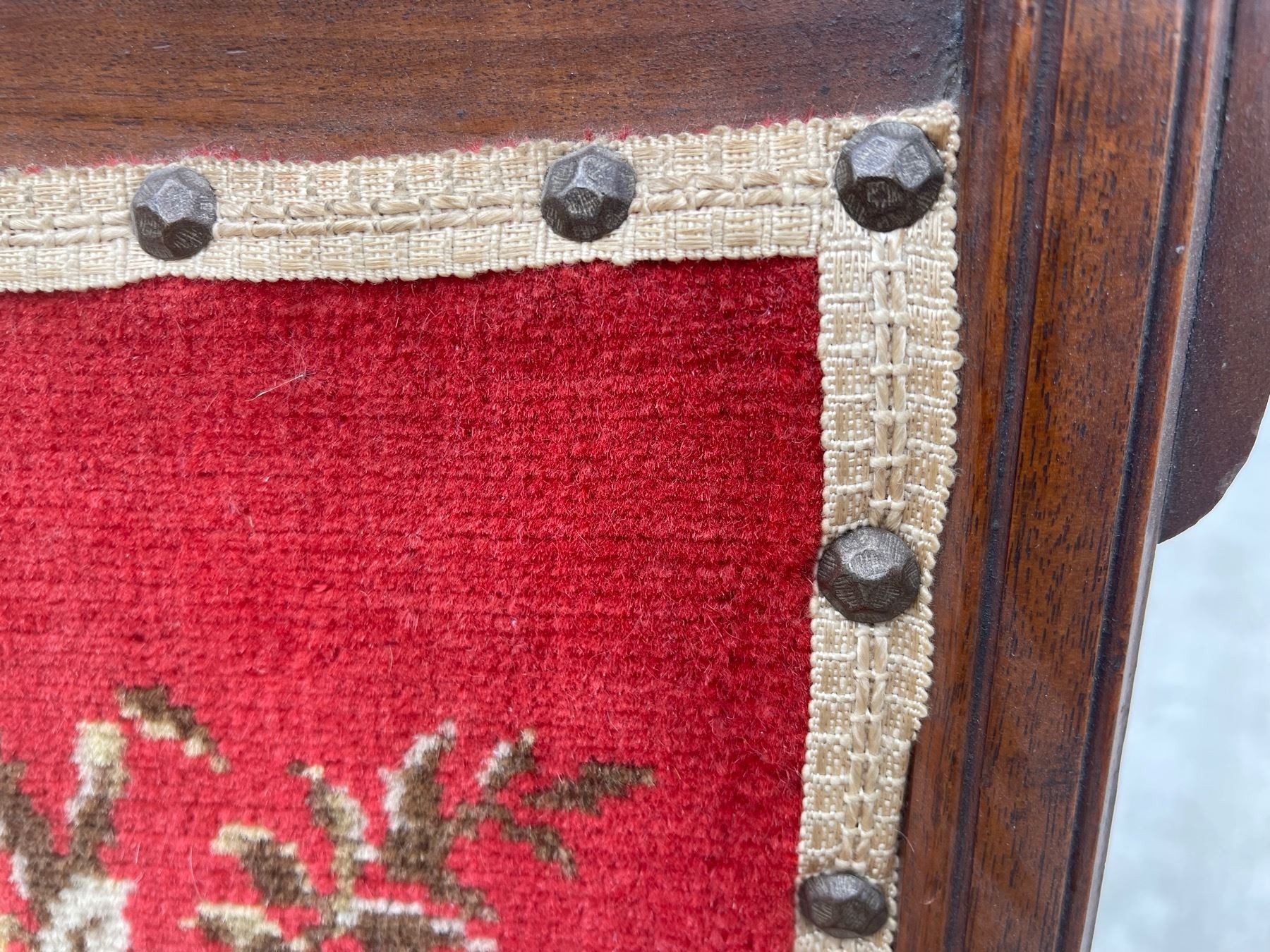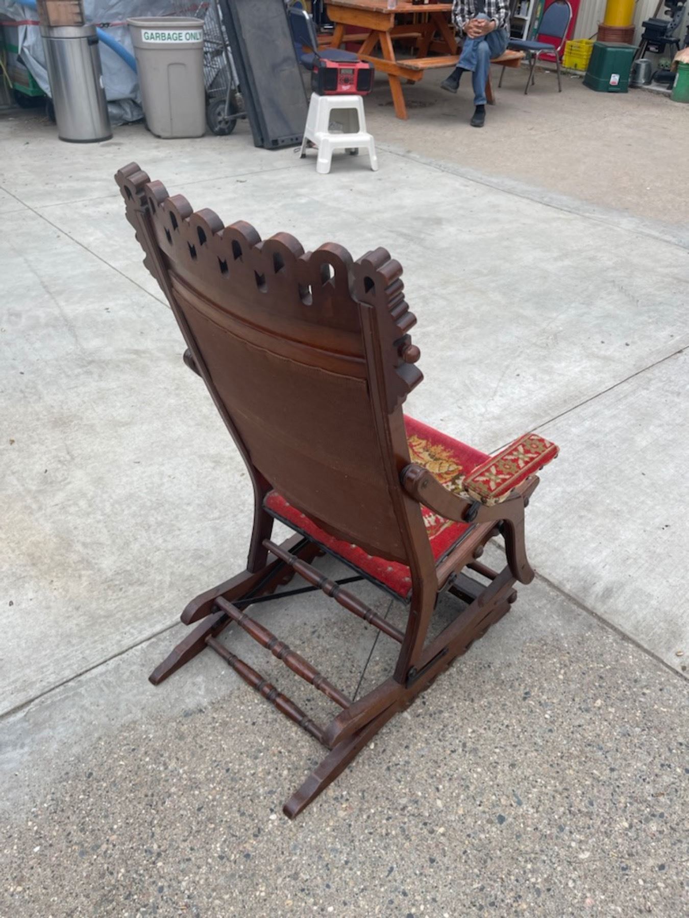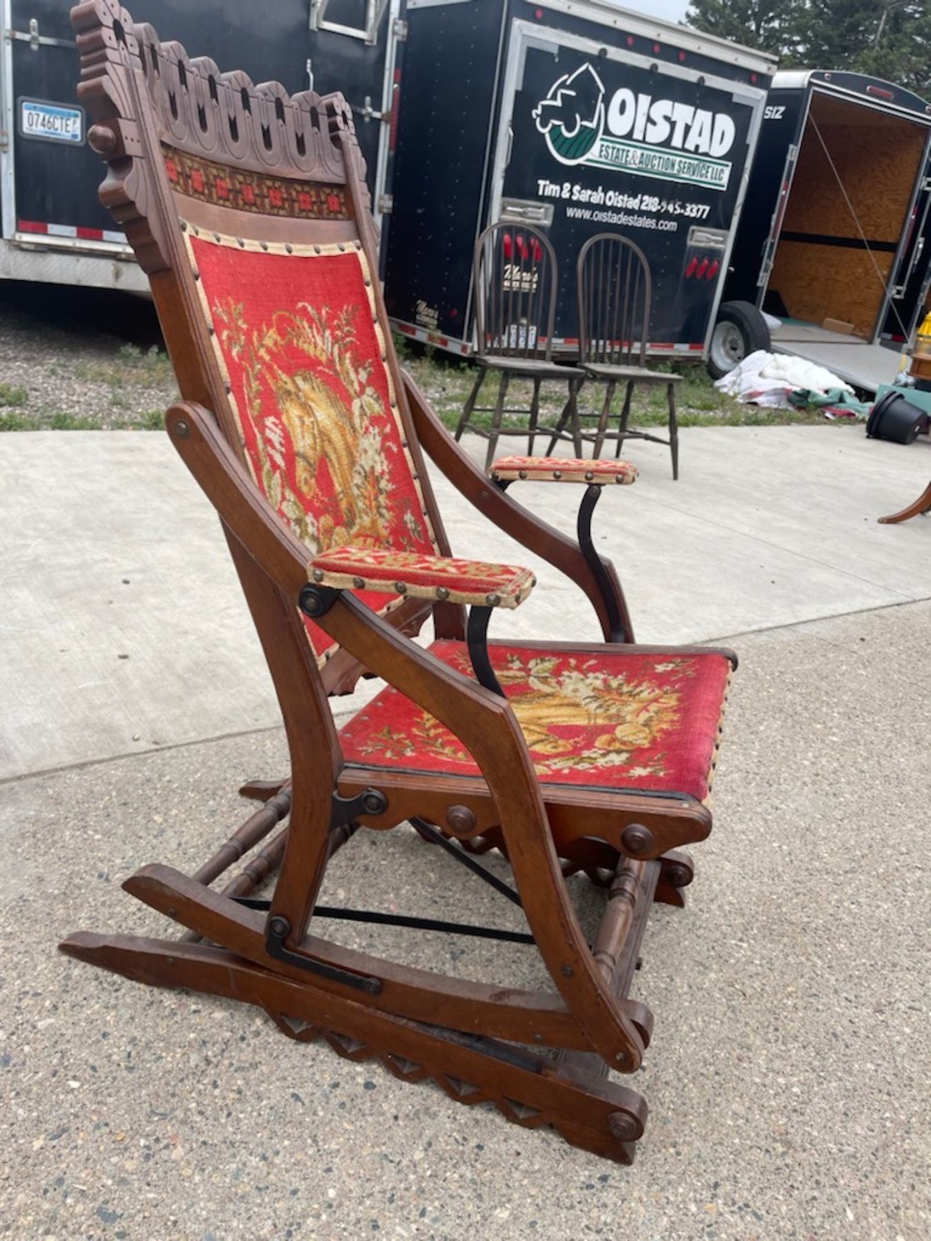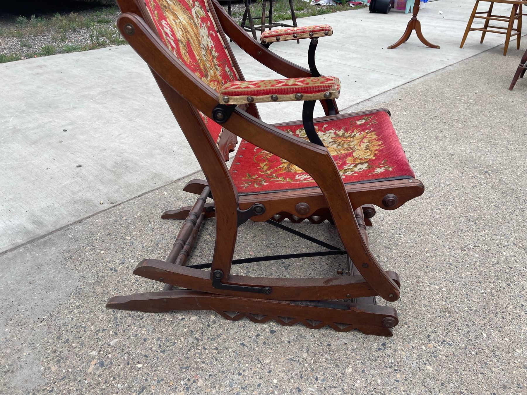 UNIQUE VINTAGE CARVED WOOD ROCKER WITH GORGEOUSLY EMBROIDERED HORSE UPHOLSTERY ON BACK AND SEAT AND FINE LOVELY ARM RESTS; NOTE THE INTRICATE STITCHING AND FINE DETAILS! THE MATERIAL IS IN GREAT CONDITION WITHOUT ANY OBVIOUS WEAR; THE BACK IS ALSO FINISHED; THE VINTAGE ROCKING MECHANISM IS INTACT AND WORKS NICELY; THIS IS A MUST FOR HORSE LOVERS!