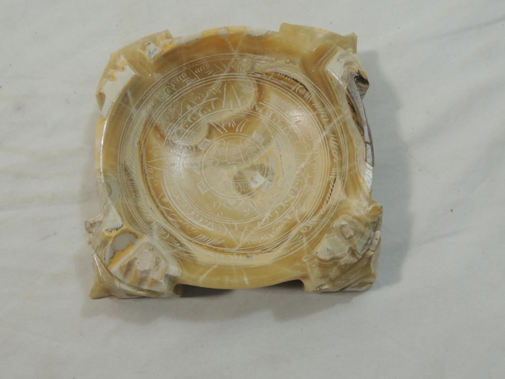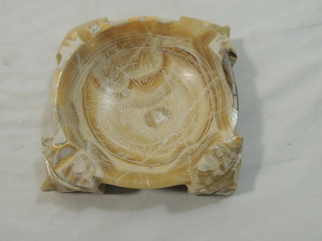 ANTIQUE ASIAN TRIBAL YELLOW AND CREAM CARVED SOAPSTONE SQUARE ASHTRAY ROUNDED AS SHOWN SEE PHOTO FOR MORE DETAILS.
