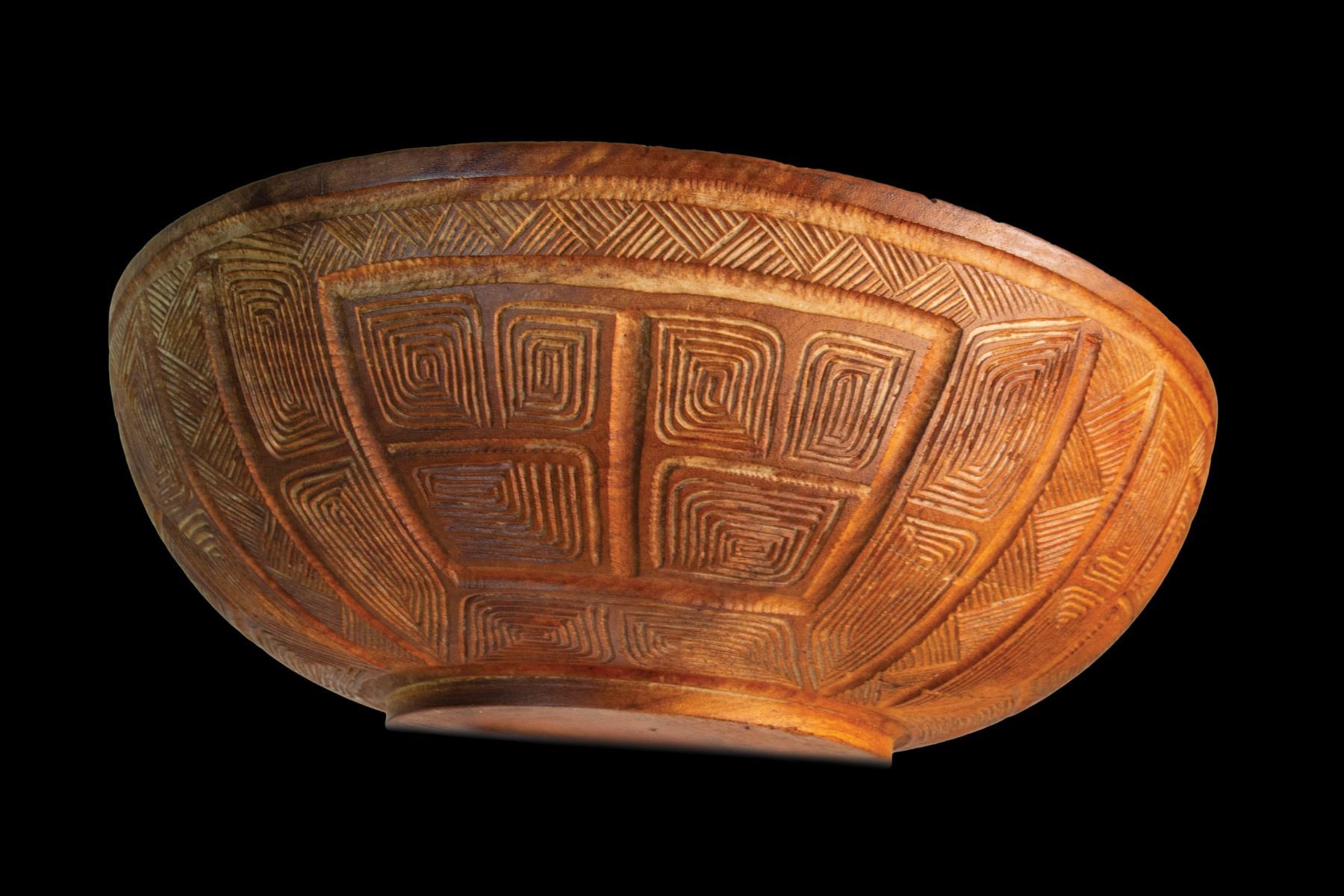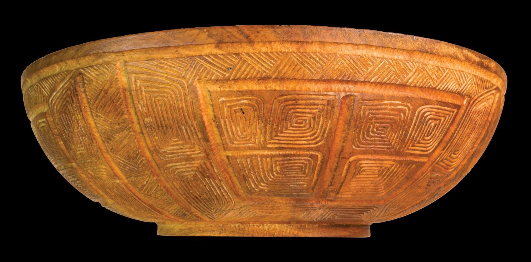 (1960s) A beautifully carved and detailed Tahitian ceremonial bowl. For a brief time in the early 1960s, OA imported these as a catalog item until the supply completely dried up. This is an OA warehouse showroom sample. 3.5"x11.5". VG+ with typical wear.