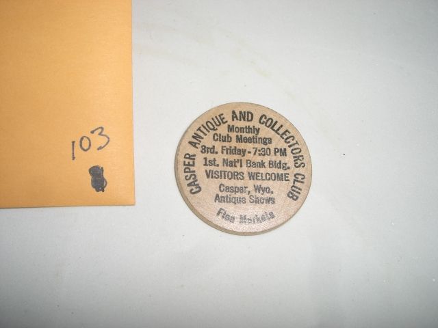 VINTAGE CASPER ANTIQUE & COLLECTORS CLUB WOODEN NICKEL COIN!! COIN CAME OUT OF SAFE!! ***Coin, Currency & All Items Listed in this auction - Grades, Conditions and Values are not Safe Deposit Coins LLC Responsibilty. Grades, Condition and Values are determined by Consigner(s) & Buyers ONLY