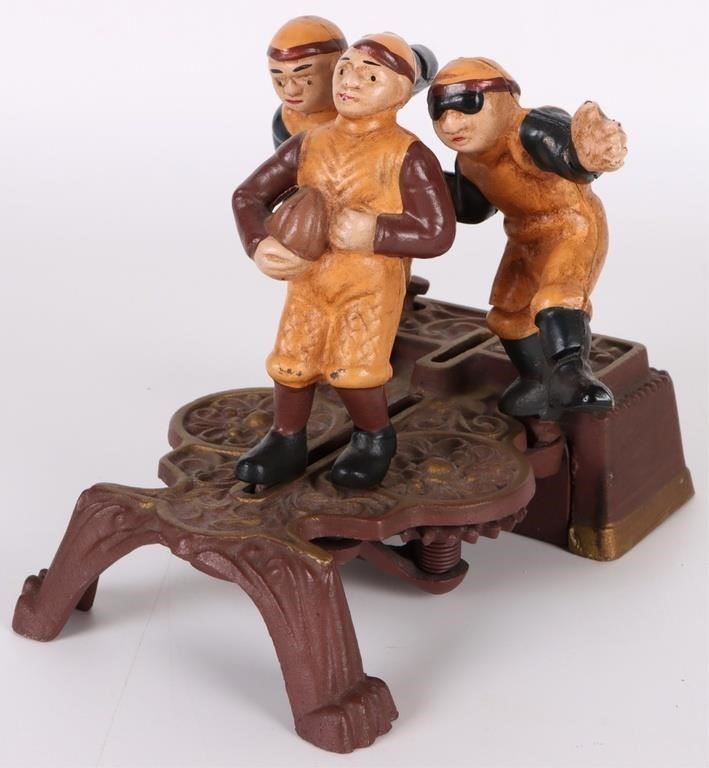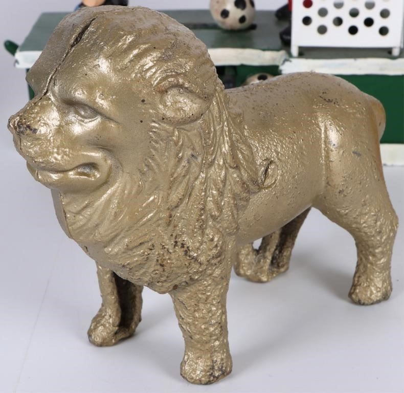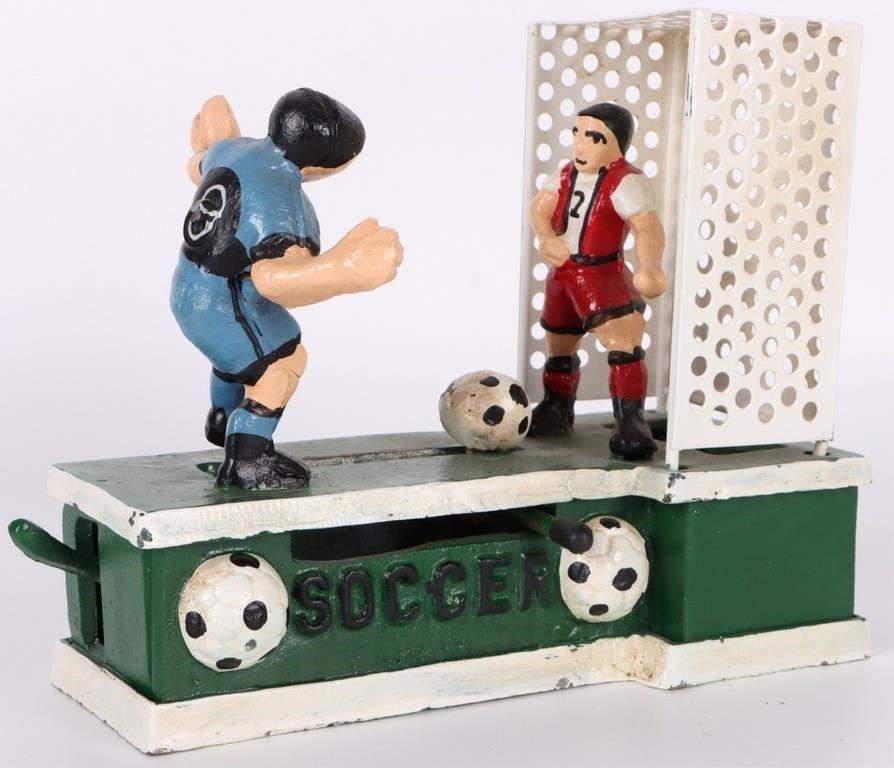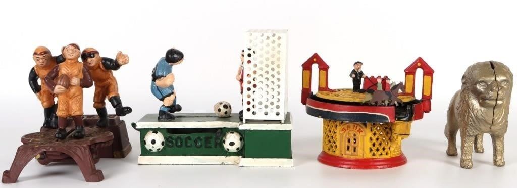 Vintage Cast Iron Coin Banks (4) to include: Rugby players Moving Coin Bank, Gold Lion (with coins inside) Bank, Horse Race Moving Coin Bank (with coins stuck in coin slot), & Soccer Penalty Moving Coin Bank.