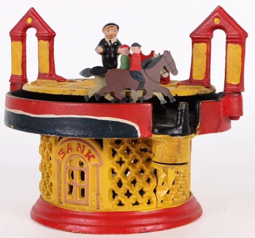 Condition: Wear commensurate with age. Coins stuck inside the Horse race Bank slot. See images.