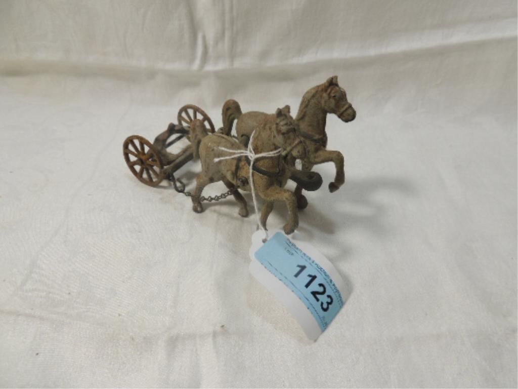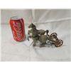 VINTAGE CAST IRON HORSES AND CARRIAGE VINTAGE DIE CAST. TWO HORSES ATTACTED TO CART WHEELS. MISSING CART. AS SHOWN. SEE PHOTO FOR MORE DETAILS.