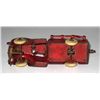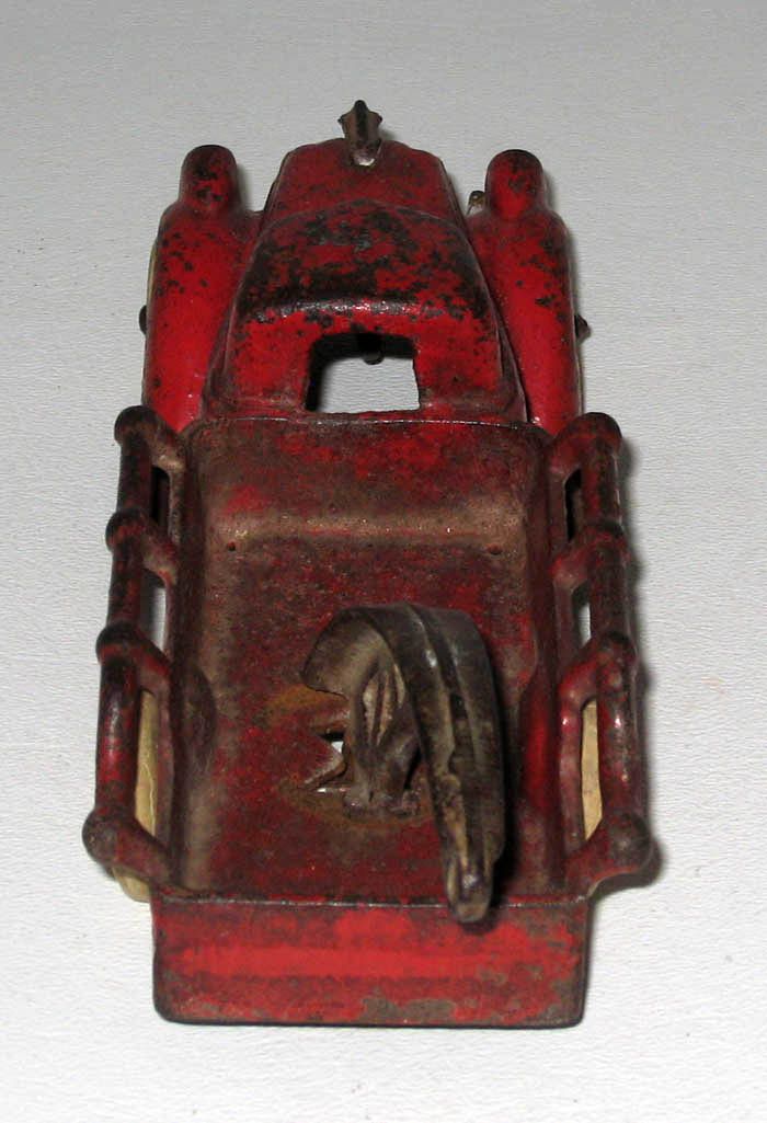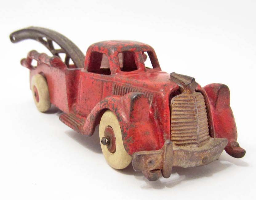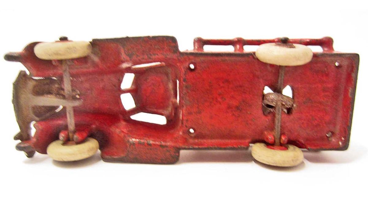 There are no cracks or breaks in the cast and the tires and hubs are intact. It is marked Hubley. There are scratches and chips in the paint from normal play and age. The front left of the grill is broken.