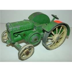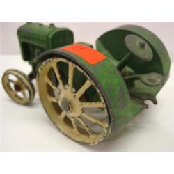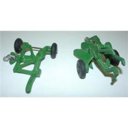 VINTAGE CAST IRON JOHN DEERE TRACTOR with two bottom plow and sickle bar mower. Shows signs of wear to paint. Hitch on back of tractor is broken and sickle bar on mower is broken.