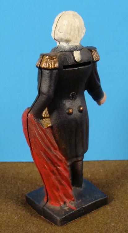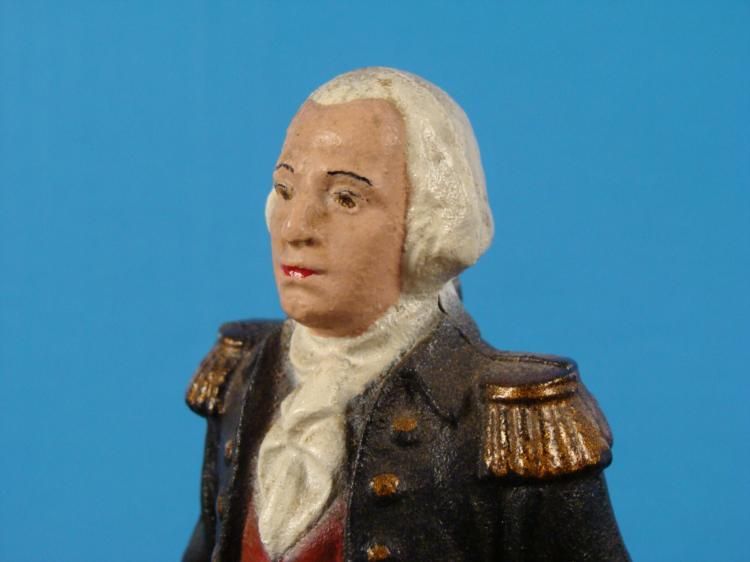 OFFERED HERE IS A VINTAGE CAST IRON STATUE OF GEORGE WASHINGTON. IT HAS A COIN SLOT IN BACK & SCREWS TO OPEN IT. THE MAKER'S MARK ON THE BASE IS HARD TO READ. THE STATUE IS PAINTED AND 6 1/2" TALL. * * * * *