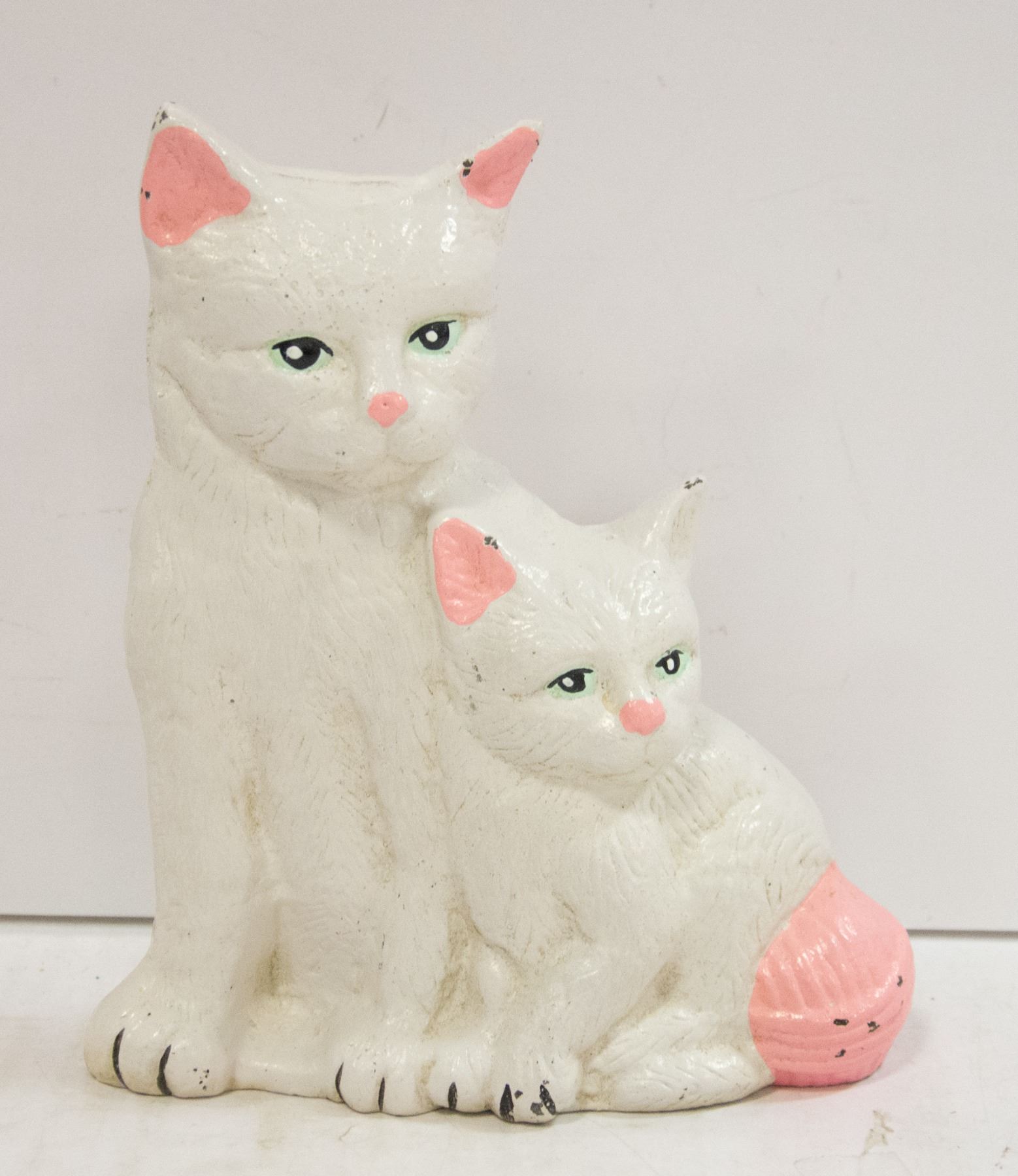 VINTAGE CAST IRON BLUE EYED WHITE CAT WITH HER LITTLE WHITE KITTEN, AND A PINK BALL OF WOOL, COLLECTIBLE DOOR STOP. HEAVY CAST IRON, WEIGHS 3 POUNDS. 7 INCHES TALL X 6 INCHES WIDE.