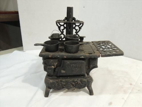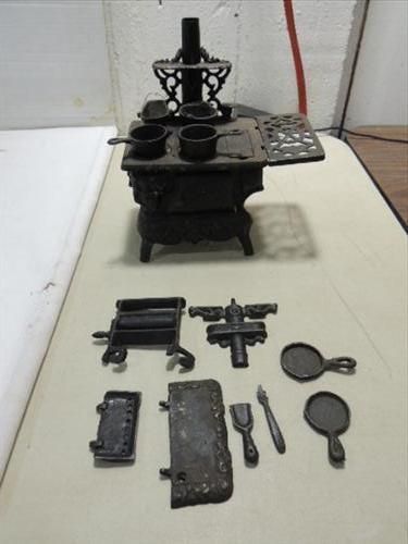 VINTAGE CAST METAL (IRON?) AMERICAN COOKING STOVE & ACCESSORIES. POTS & PANS. AS SHOWN. VIEW PICTURE FOR DETAIL.