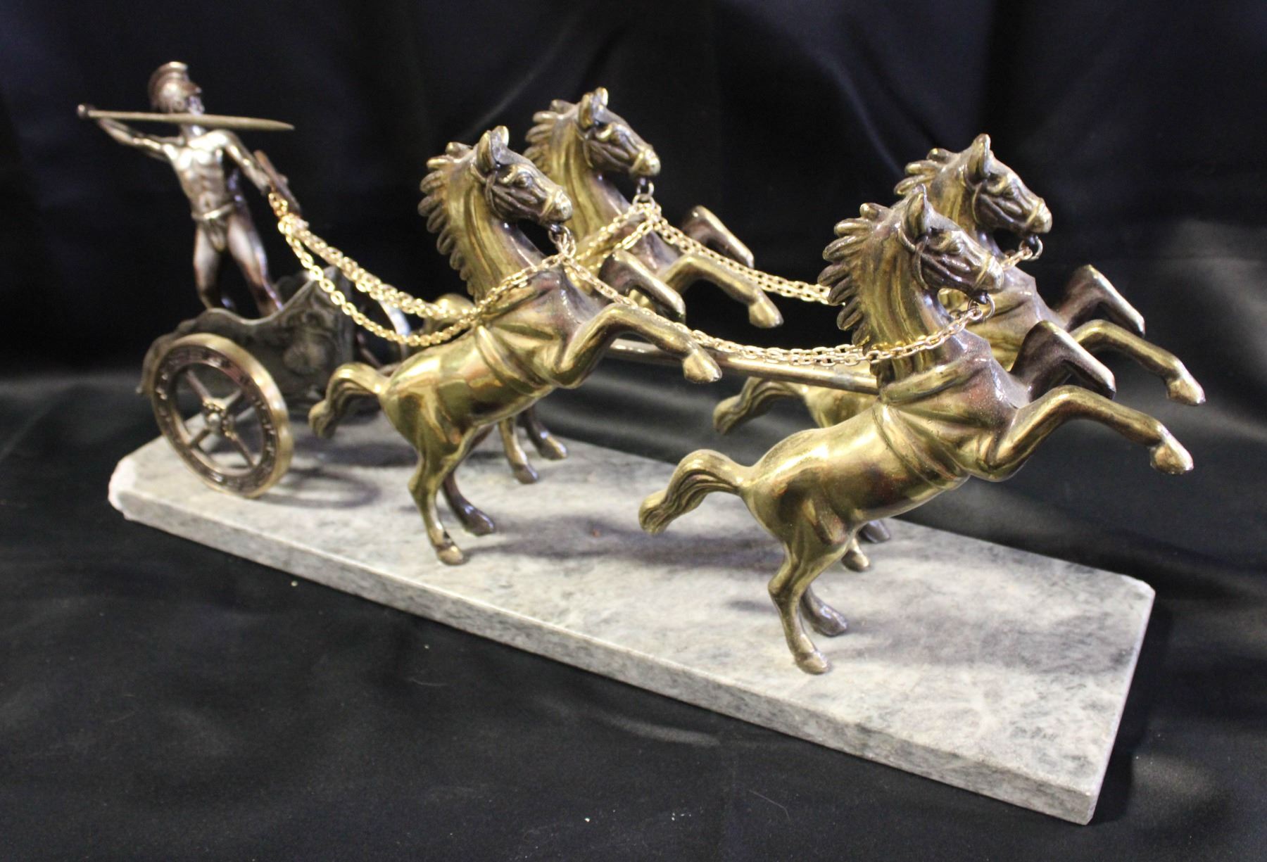 HAS BEEN REPAIRED- MARBLE BASE CHIPPED, CHARIOT IS DETACHED FROM POLE ON THE HARNESS