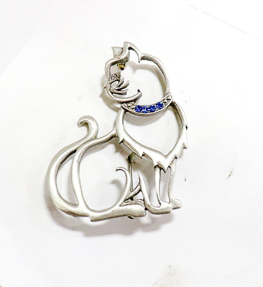 VINTAGE CAT PEWTER BROOCH W/ BLACK AND RED STONES