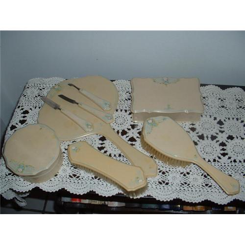 NINE PIECE CELLULOID VANITY SET. This beautiful vanity set includes a mirror, powder box with lid, clothing brush, hair brush, jewelry box with attached lid, and three manicure impliments. All of the items are matching with decorative flowers on each item. All items are in excellent condition with no cracks in the celluloid. The bristles in the brushes are in excellent condition. Please look at the pictures and note that all pieces match and are all quite lovely. It is a large set both in size (12" mirror) and in the number of items in the set. If you have any questions, please send an email. I will answer. Thanks for your interest!