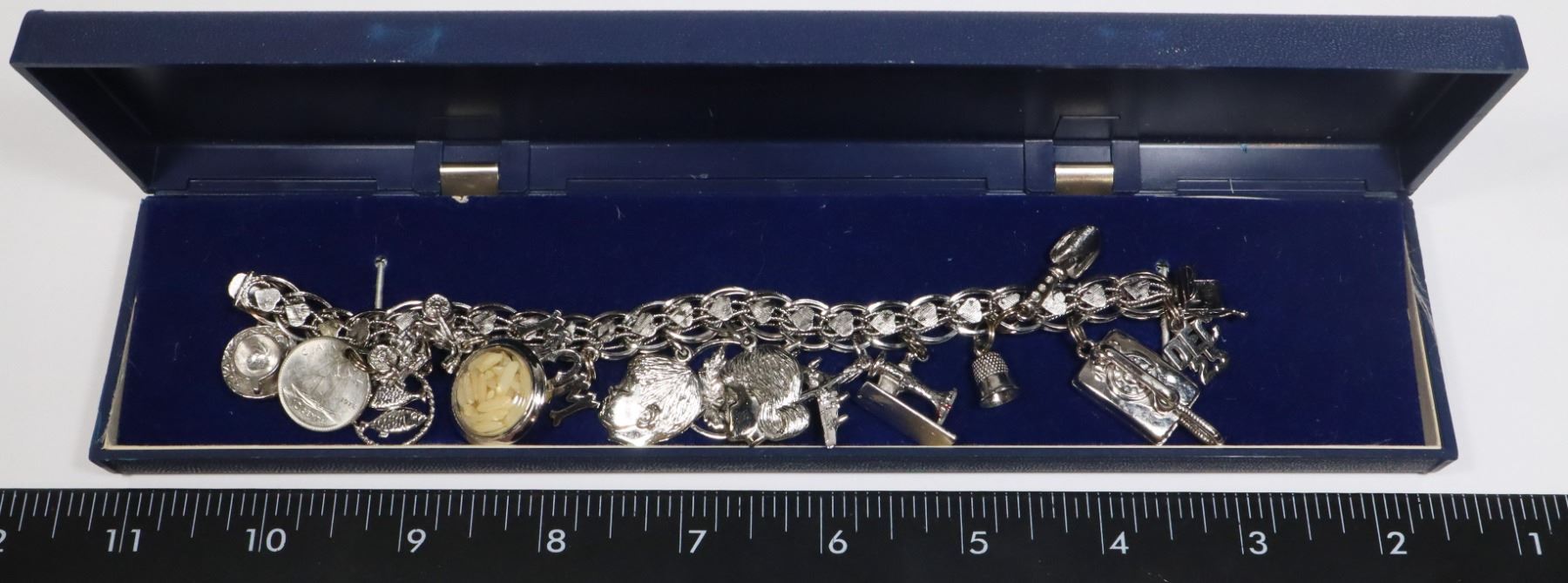 VINTAGE CHARM BRACELET, SOME PIECES STAMPED