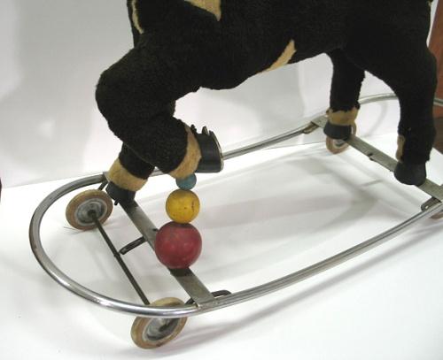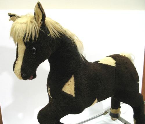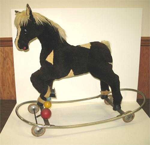 VINTAGE CHILD'S HORSE RIDING TOY. Large stuffed horse rests on metal base and hard rubber wheels. Horse shows some signs of wear and loss of fabric at ears. 30" H, 36" L