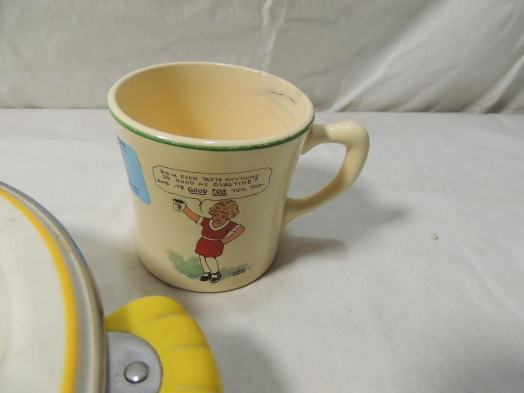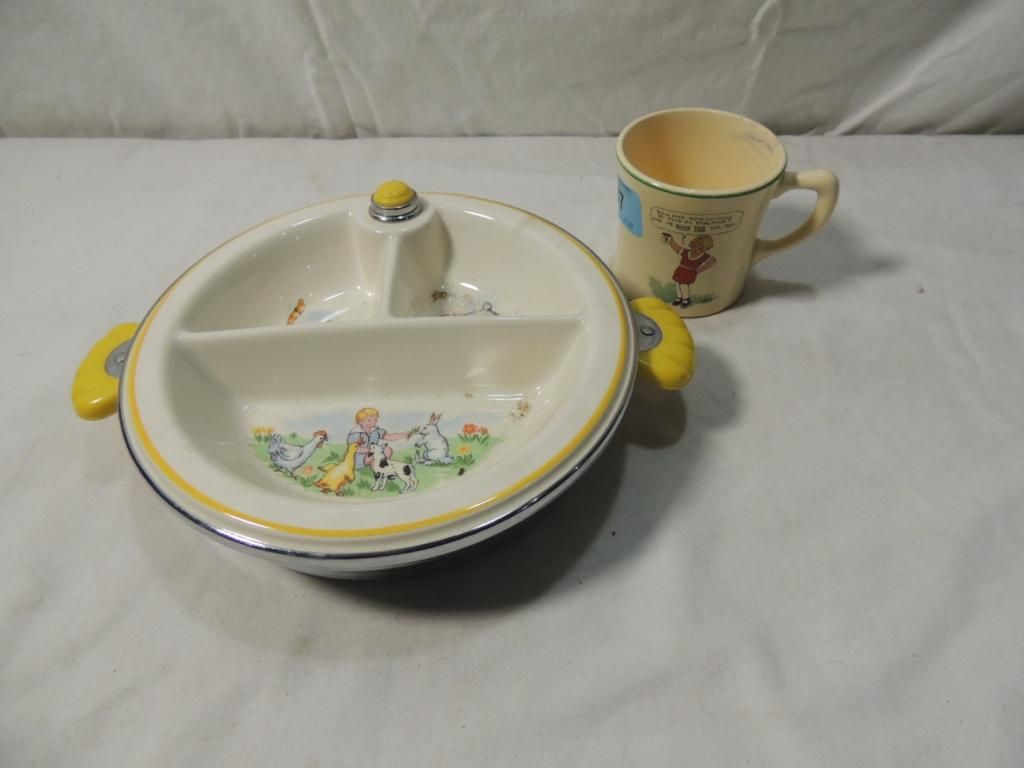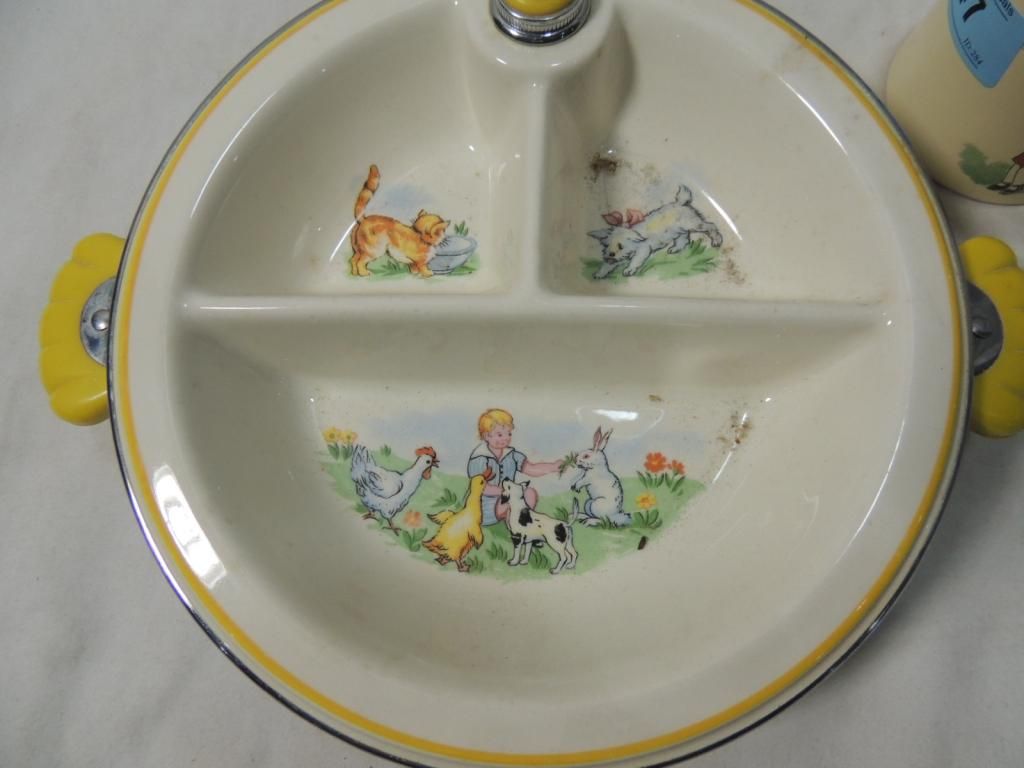 LITTLE BOY BLUE SEPERTATED SERVING BOWL WITH BOWL UNDER FOR WARM WATER AND CUP VINTAGE SET. AS SHOWN SEE PHOTO FOR MORE DETAILS.