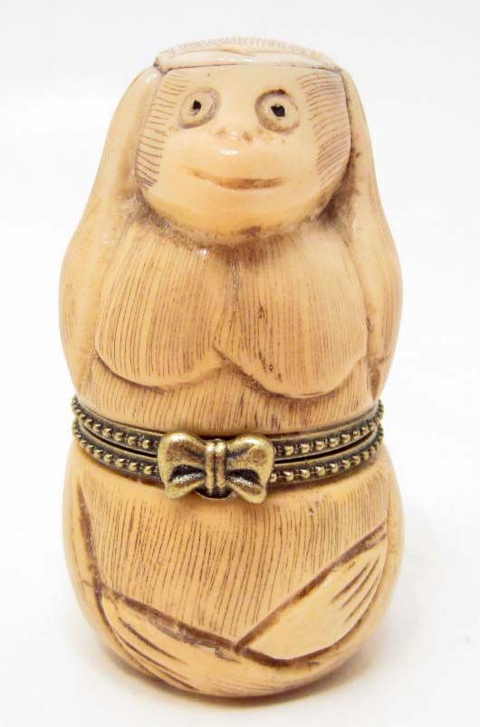 Classic 'Hear No Evil' design, hinged open in the middle, measures approx 2-3/8" tall.
