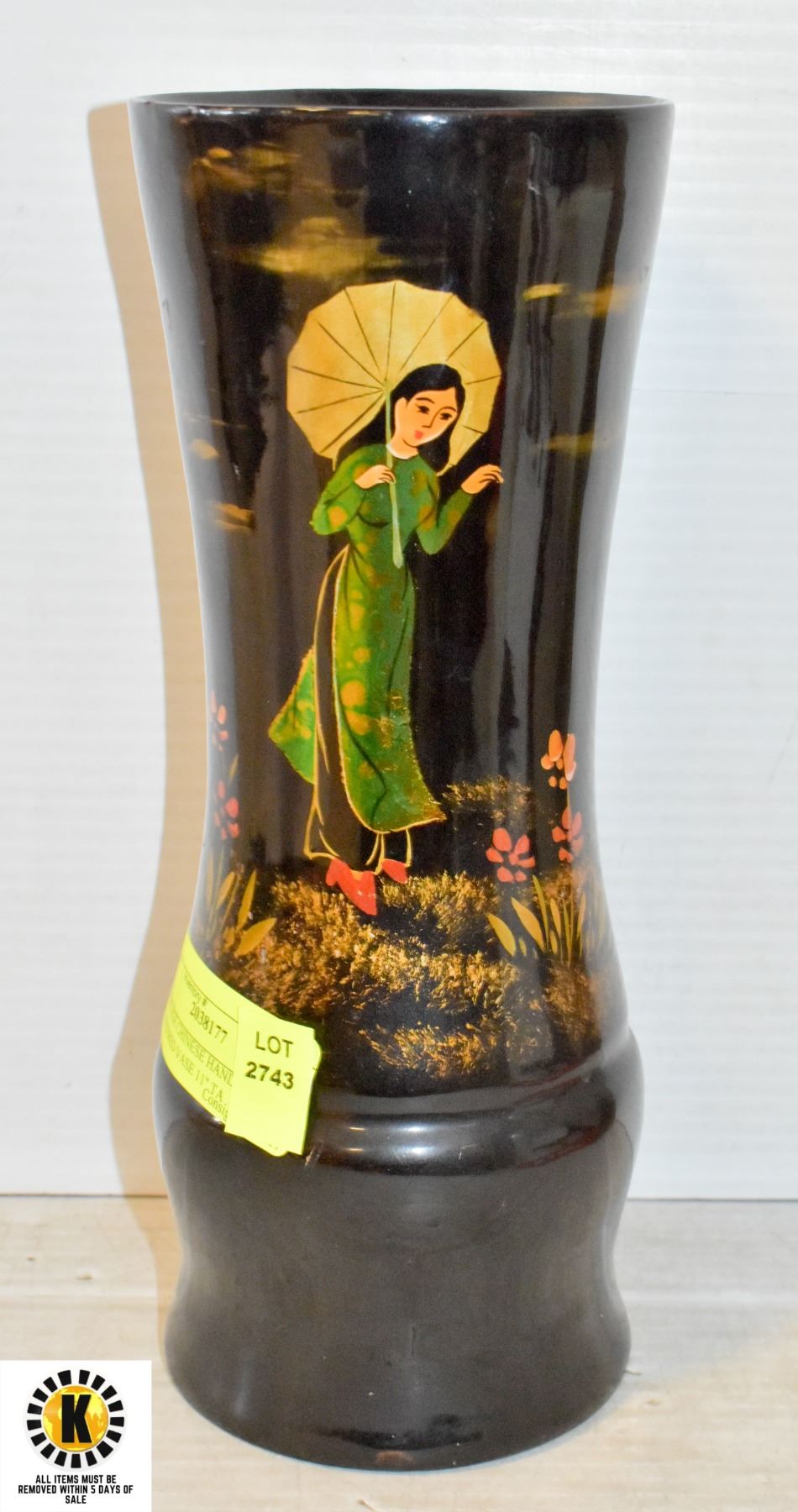 VINTAGE CHINESE HAND PAINTED LAQUERED VASE 11" TA