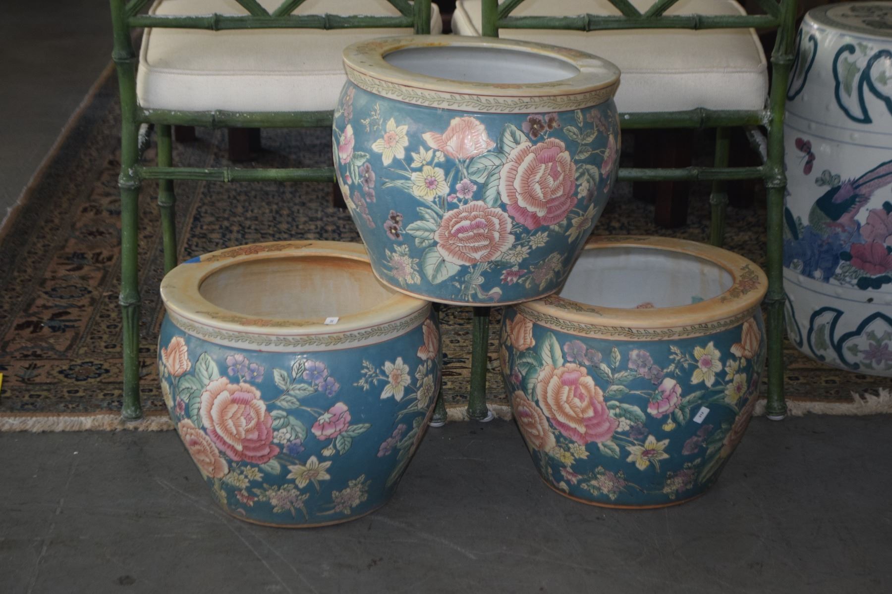 VINTAGE CHINESE PLANTER/FISHBOWL, PINK & BLUE FLORAL MOTIF & GOLD FISH INTERIOR (12") (3 PCS)