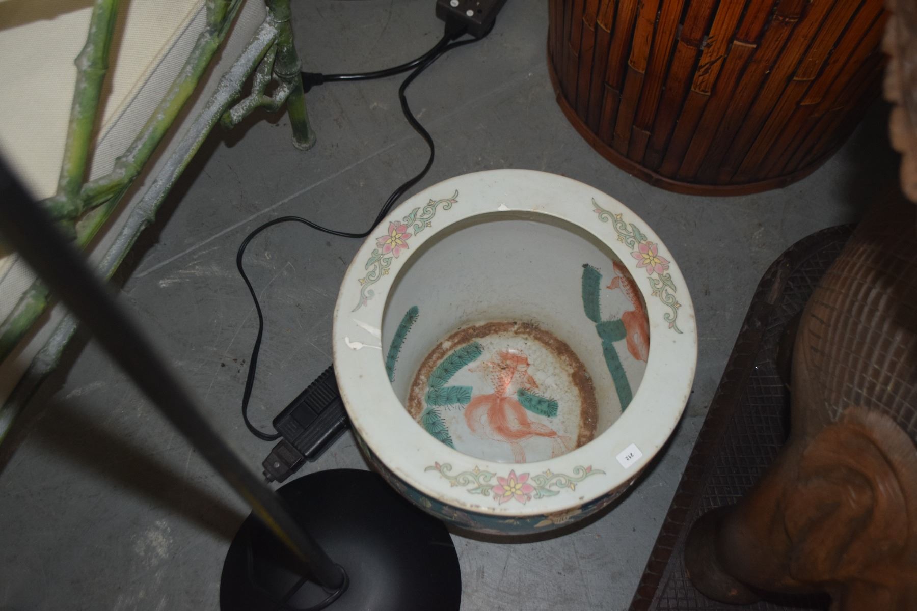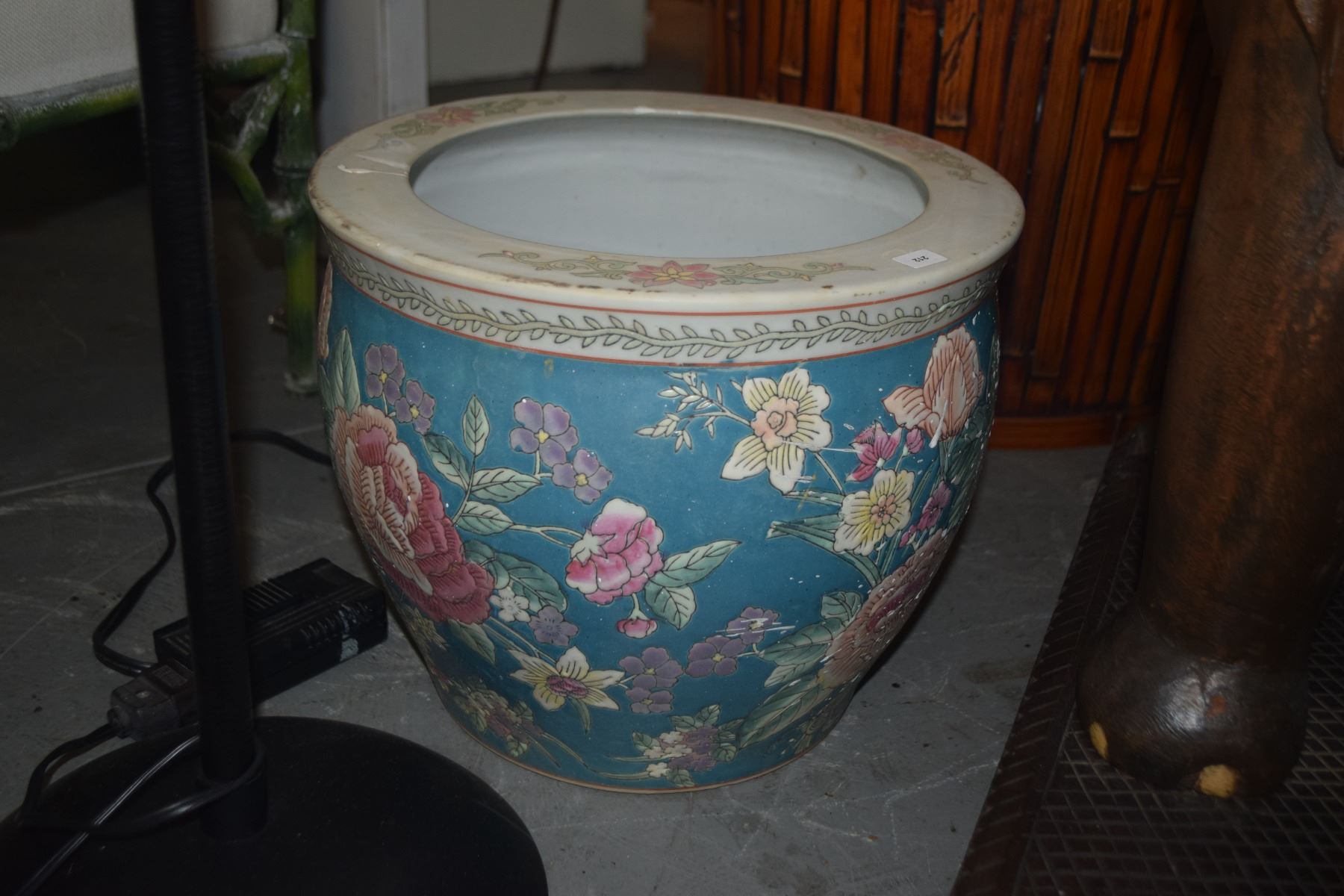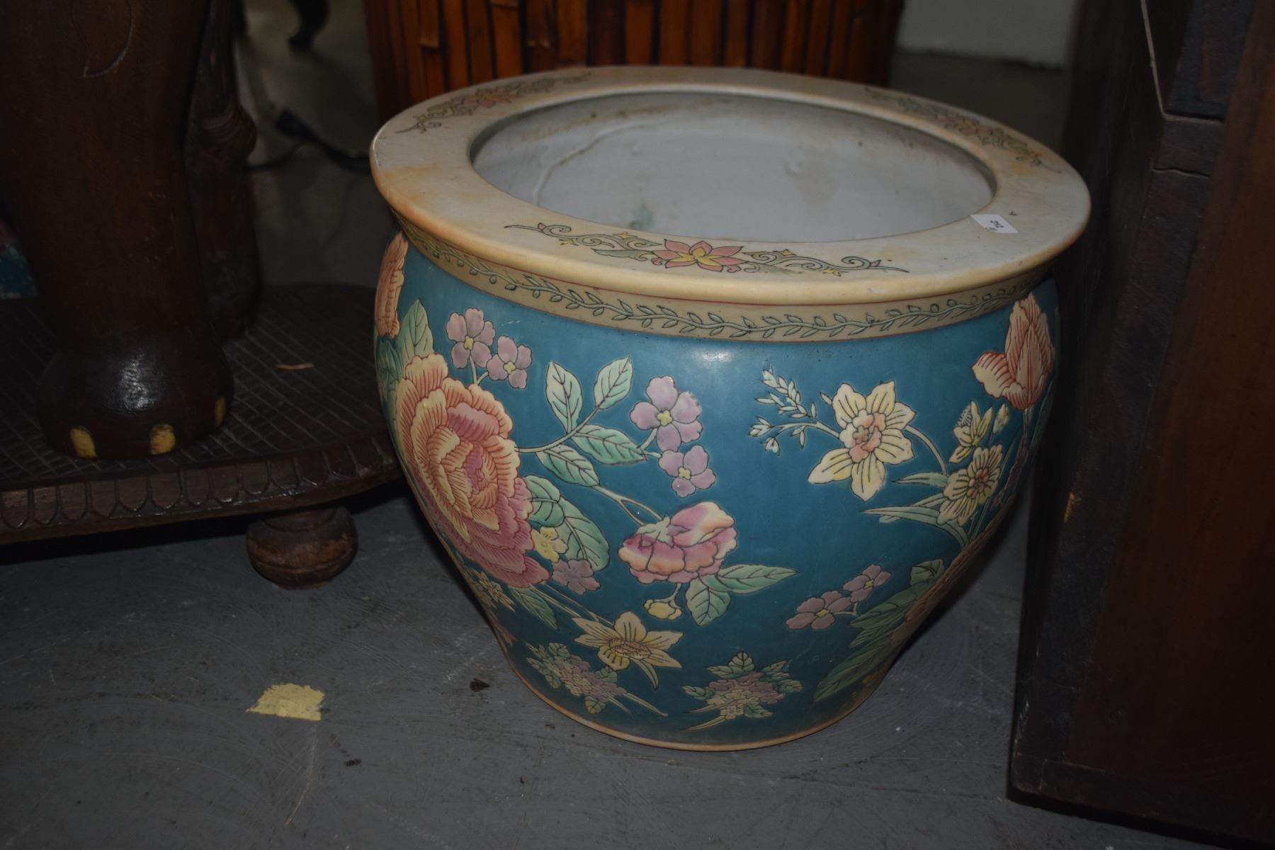 VINTAGE CHINESE PLANTER/FISHBOWL W/PINK & BLUE FLORAL MOTIF & GOLDFISH INTERIOR (3 PCS)