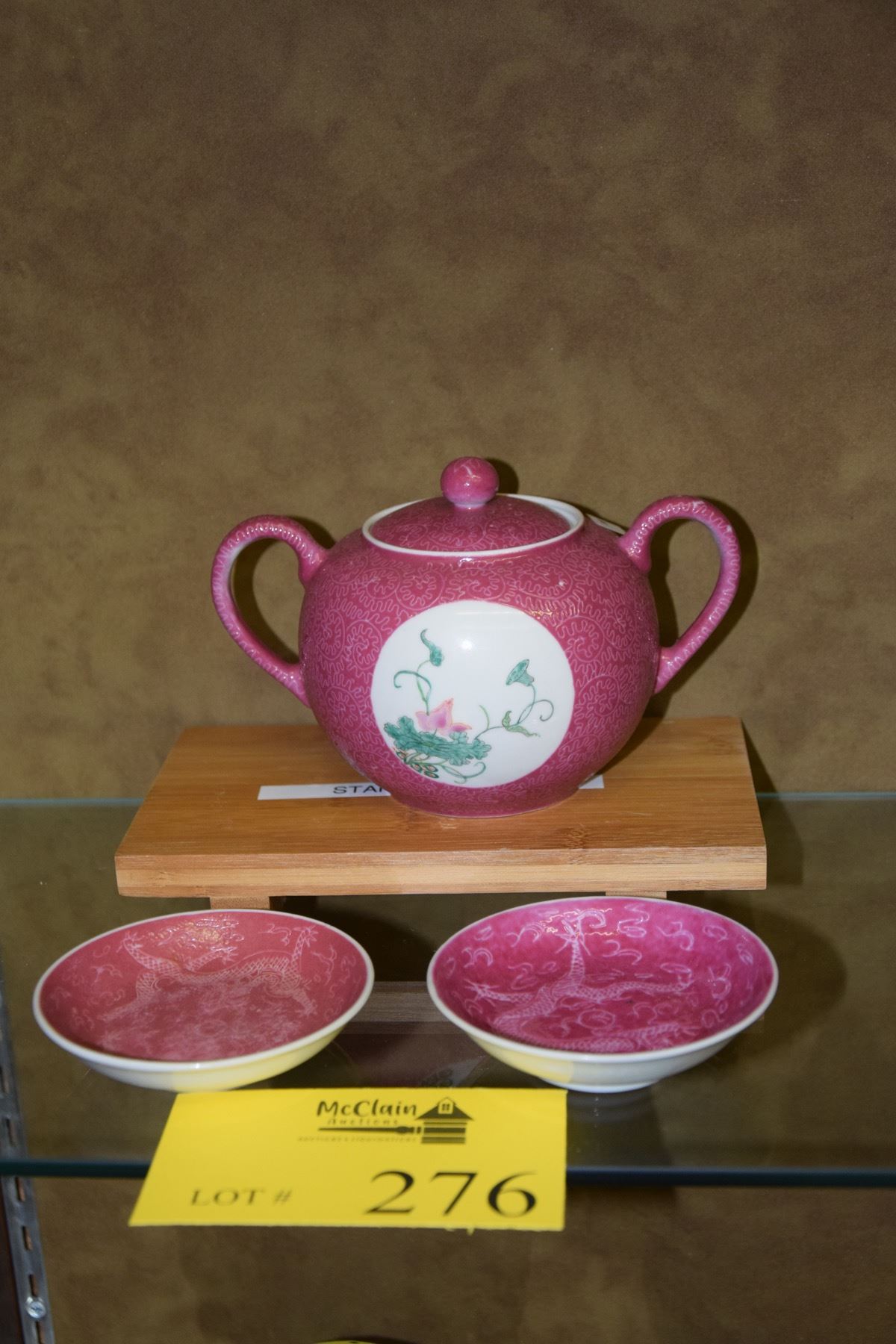 VINTAGE CHINESE (RARE) ROSE DU BARRY PORCELAIN LIDDED POT & 2 DRAGON DISHES; SIGNED (3 PCS)