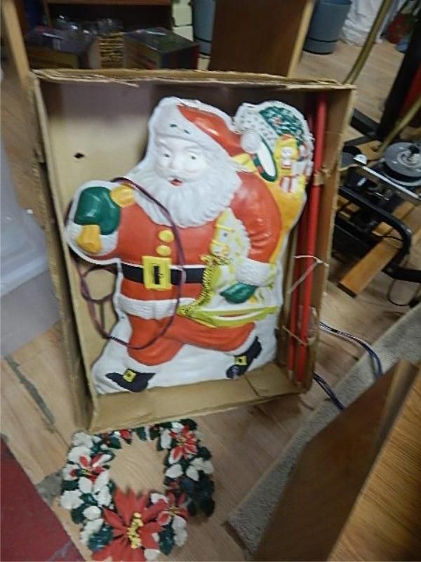 VINTAGE CHRISTMAS SANTA IN ORIGINAL BOX - LITES UP - WORKING - WITH OLD PLASTIC WREATH - 1950'S