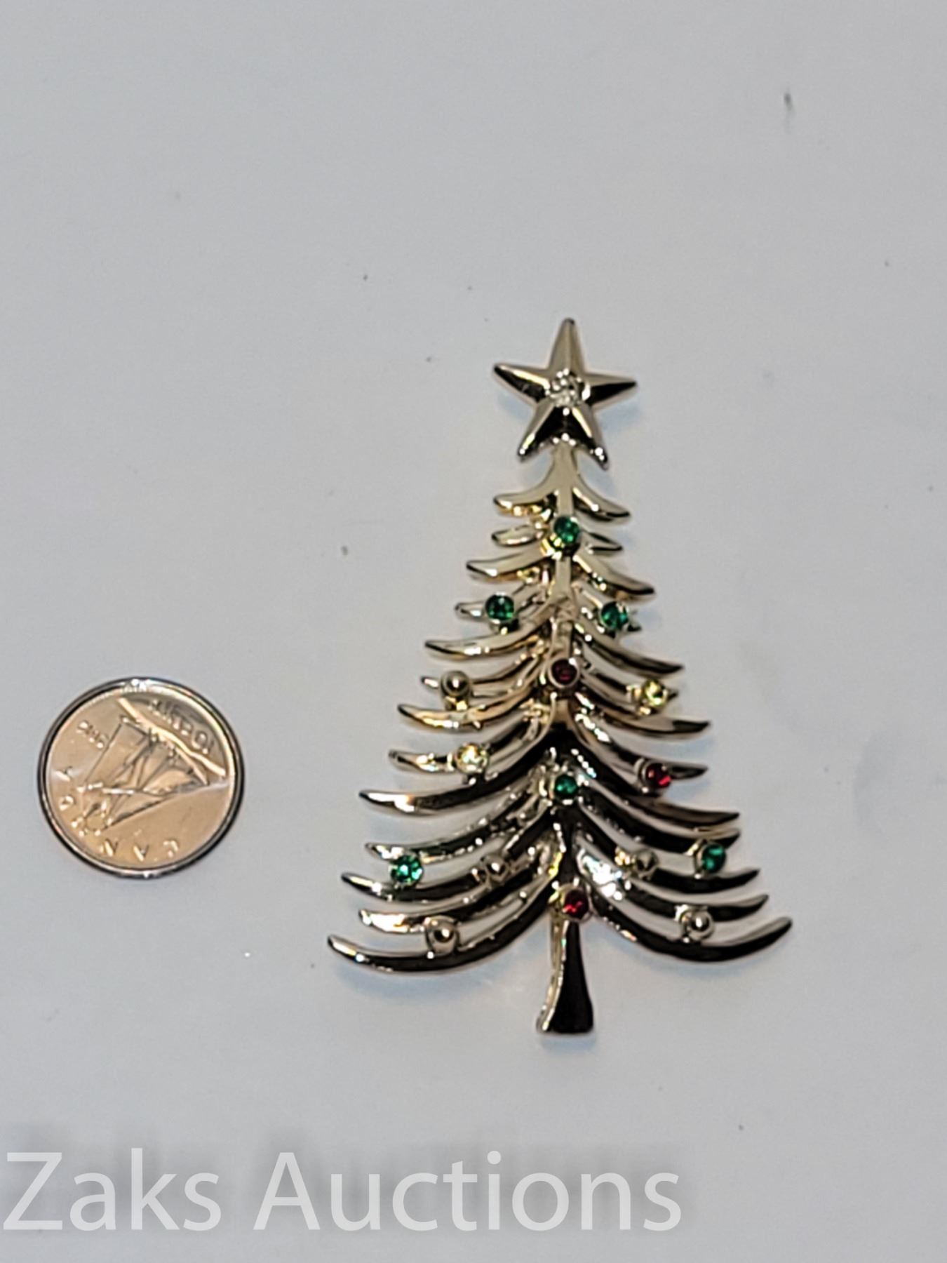 THIS IS PROBLABLY FROM THE 70S. I GREW UP SEEING MY MOTHER WEAR THIS. SWEET WITH LITTLE RED AND GREEN STONE BALL ORNAMENTS AND LITTLE GOLD BALLS TOO.