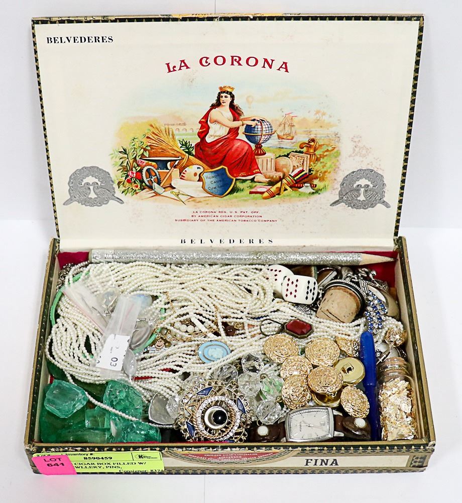 VINTAGE CIGAR BOX FILLED W/ MIXED JEWLLERY, PINS,