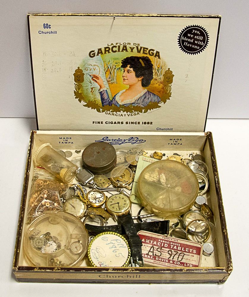 VINTAGE CIGAR BOX FULL OF ASSORTED WATCH PARTS