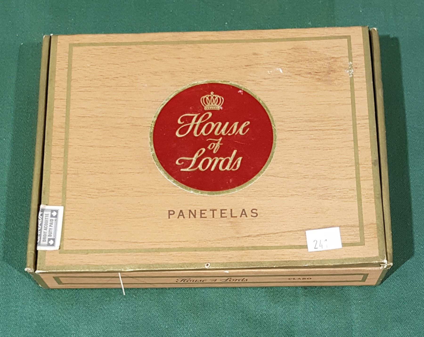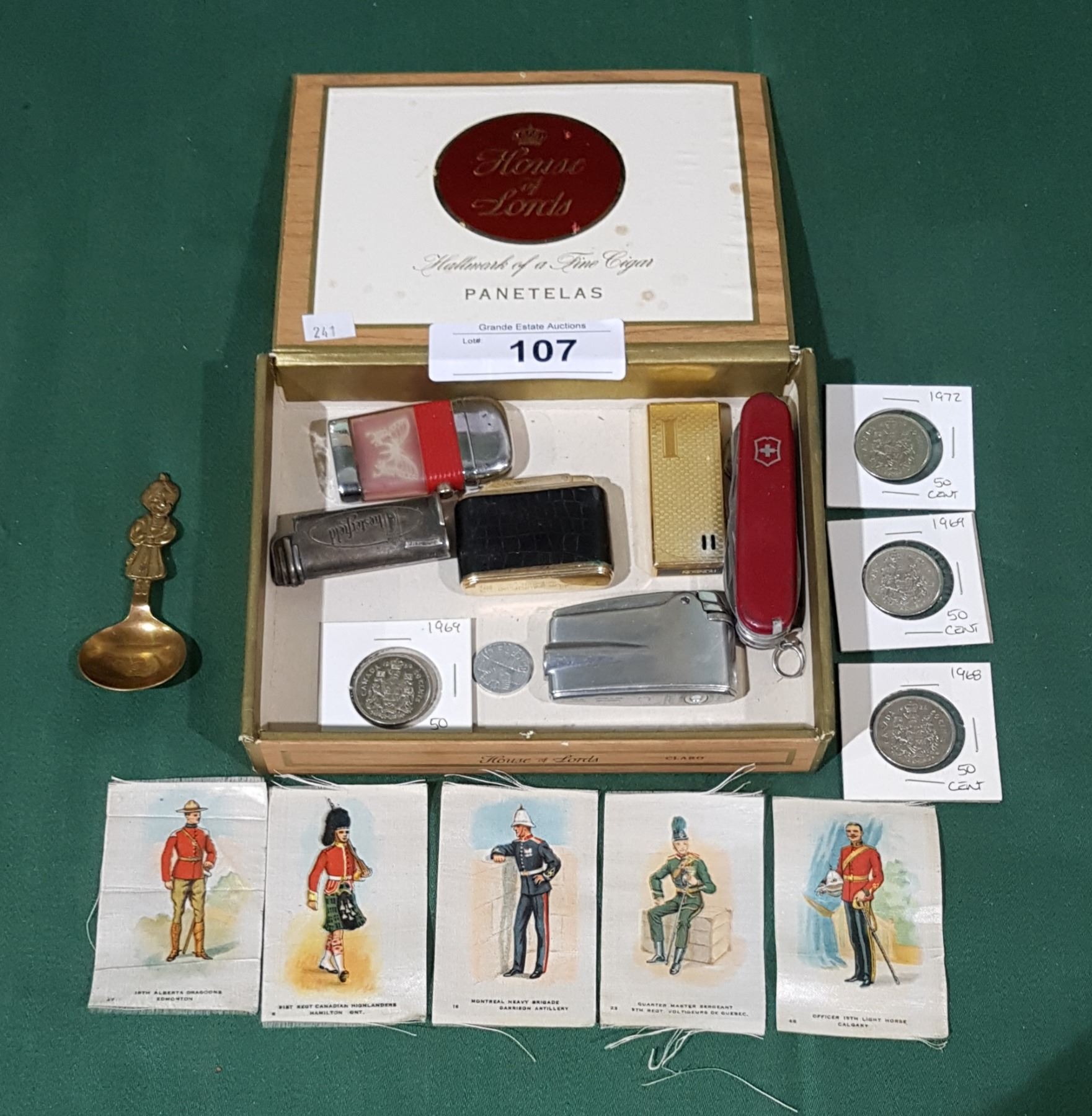 VINTAGE CIGAR BOX W/IGHTERS, 50 CENT COINS, NABOB SPOON ETC