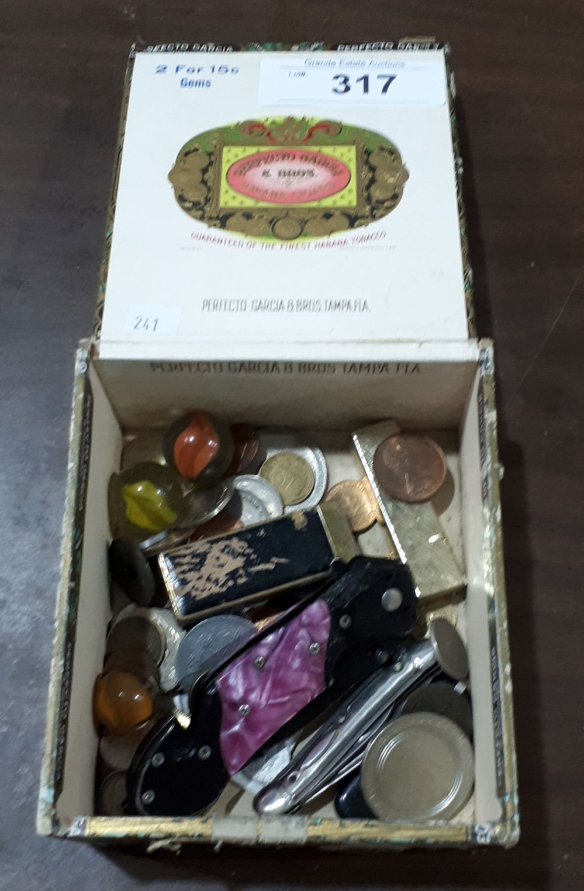 VINTAGE CIGAR BOX W/WORLD COINS, KNIVES, LIGHTERS, MARBLES ETC