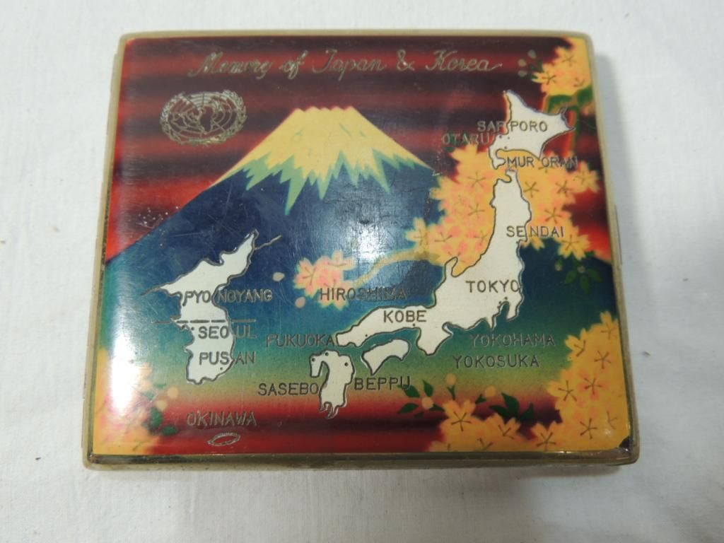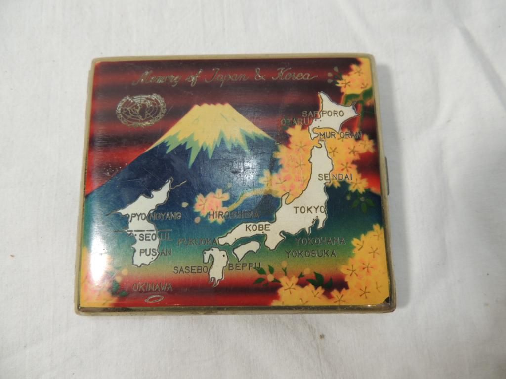 VINATAGE CIGARETTE CASE. WW2 WORLD WAR 2 MEMORIBILIA. MEMORIAL POSSIBLY. PAINTED DECORATIVE CASE ENGRAVED MEMORY OF JAPAN & KOREA. AS SHOWN. SEE PHOTO FOR MORE DETAILS.