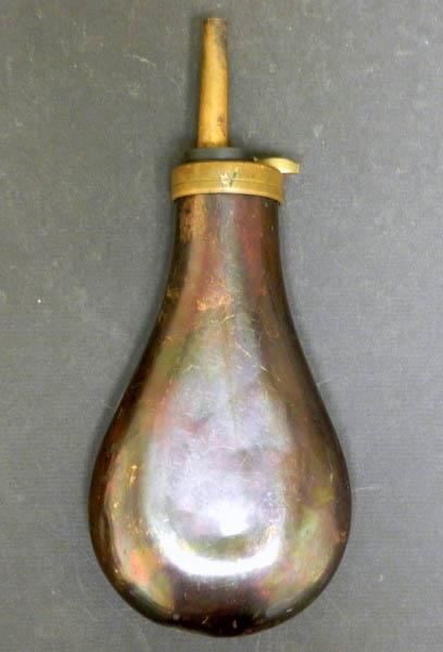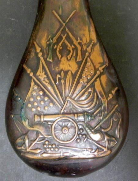 THIS IS A VINTAGE CIVIL WAR POWDER HORN--FLAGS-RIFLES AND CANNON ON FRONT-BRASS. ONE SCREW MISSING ON TOP RING-OTHER TWO PRESENT-NICE PATINA-PUSH GUARD WORKS FINE--