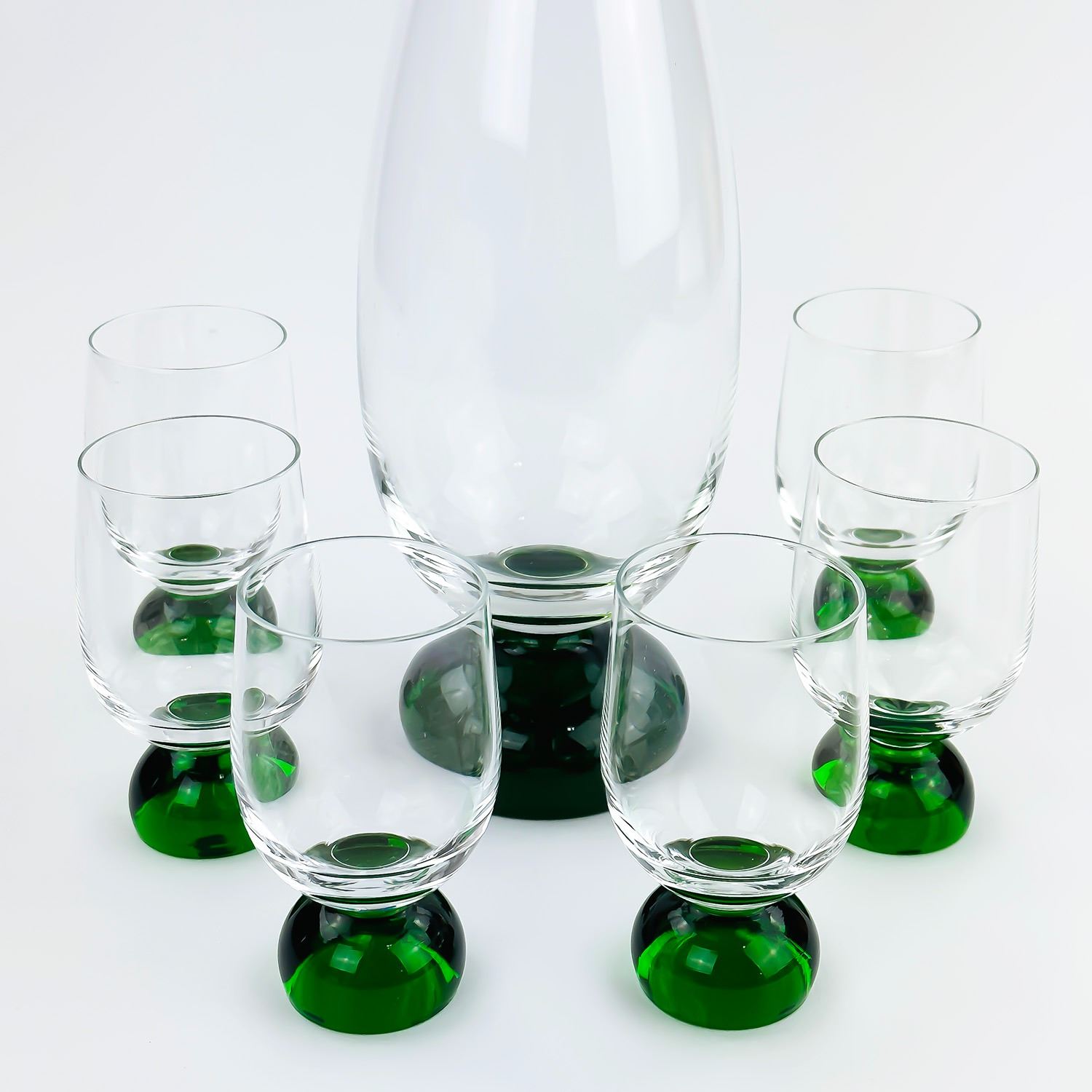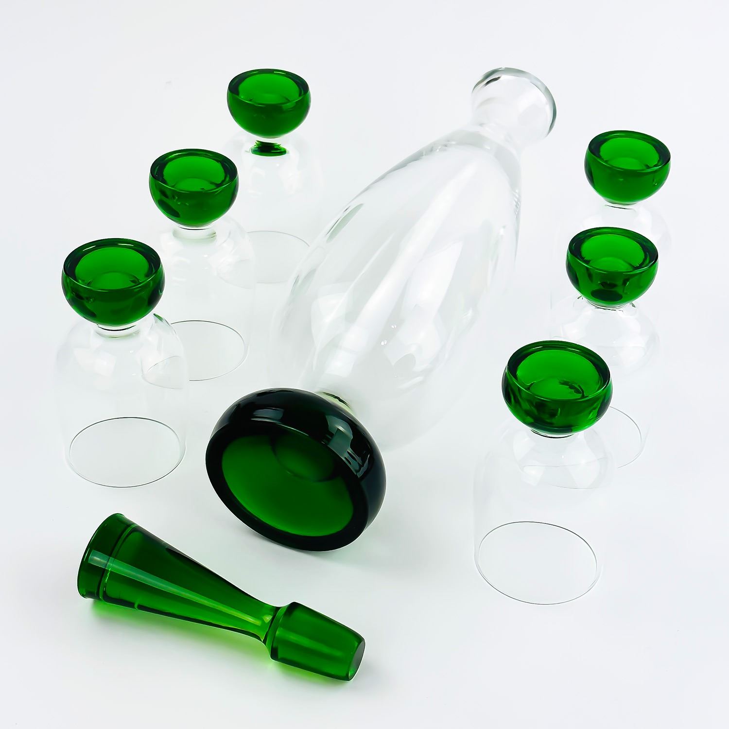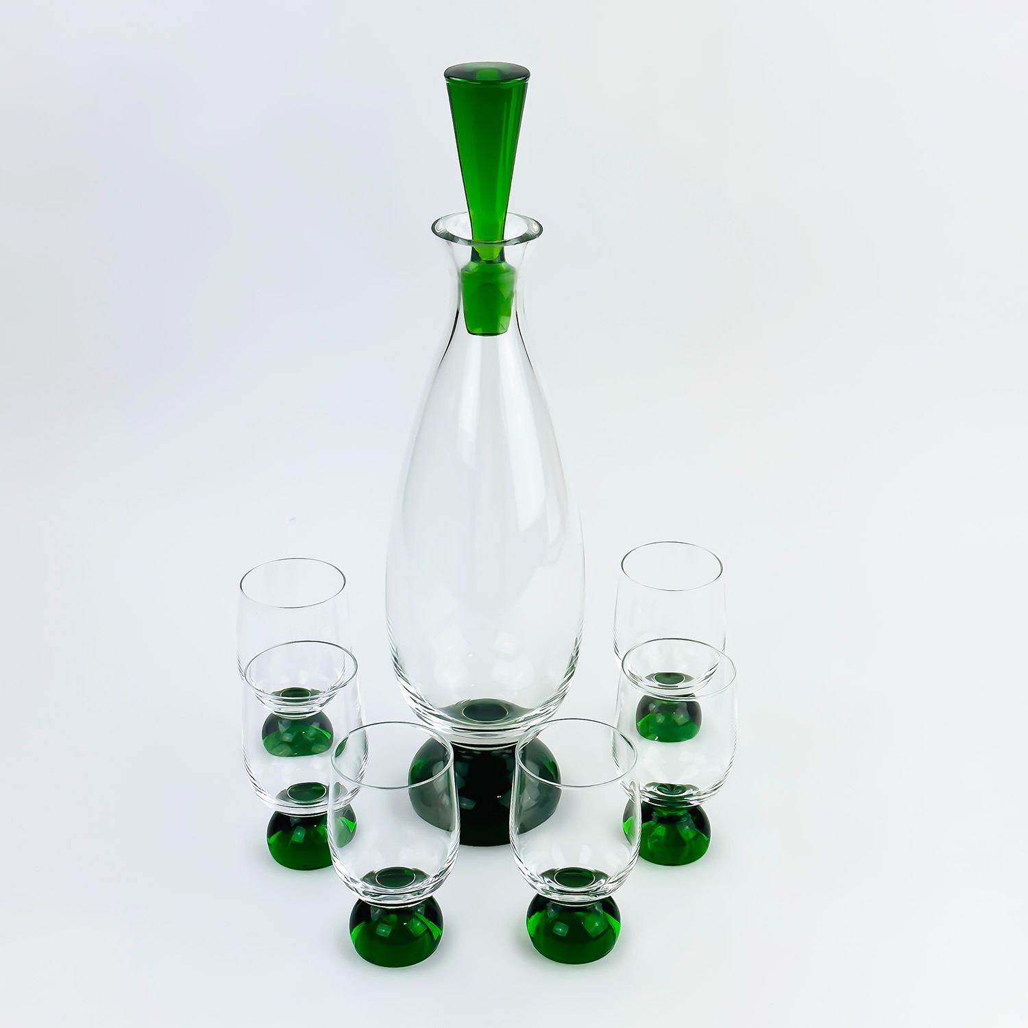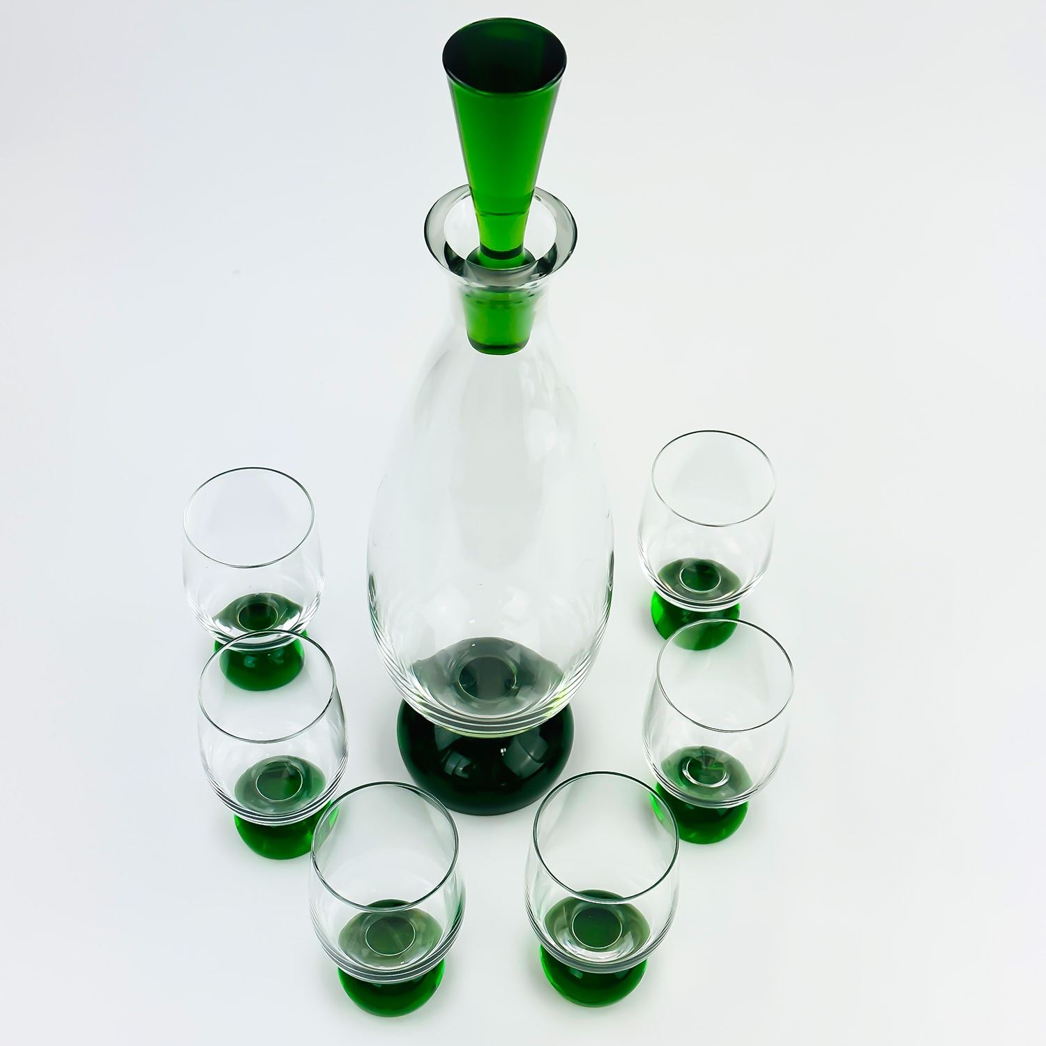 #8067 - DECANTER SET IS UNMARKED - COMES WITH 6 GLASSES. SET IS IN GOOD USED CONDITION - SMALL CHIP/NIK ON THE TOP RIM OF THE DECANTER - NOT AT ALL BAD. DECANTER MEASURES: 14.75” (37.5 CM) TALL - WITH STOPPER AND HAS A 3” (7.5 CM) DIAMETER BASE. GLASSES MEASURE: 4” (10 CM) TALL AND HAVE A 1.5” (4 CM) DIAMETER BASE. BASES OF DECANTER AND GLASSES ARE SMALLER THAN THEIR LARGER WIDTH DIAMETER.