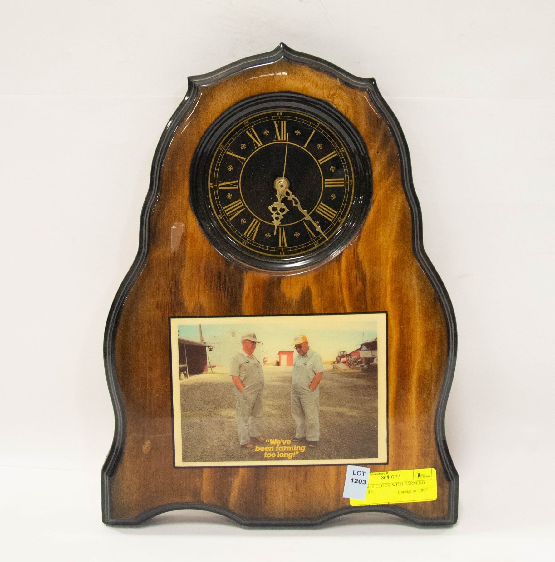 VINTAGE CLOCK WITH ICONIC FARMING PICTURE "WEVE BEEN FARMING TOO LONG" QUOTE